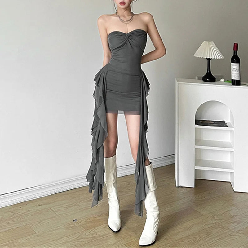 Conjunto de 2 piezas para mujer, estilo Y2K, color liso, sin tirantes, con parte delantera torcida y falda corta, ropa de club de los años 2000.