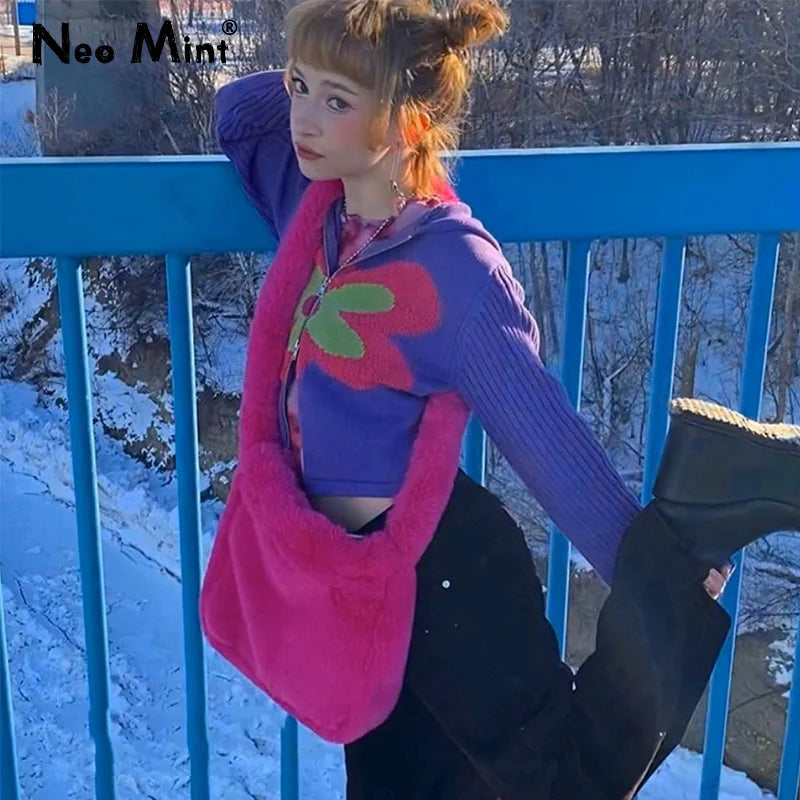 Bolso bandolera de felpa rosa caramelo para mujer, estilo Harajuku de invierno, estilo años 2000, estilo urbano, de piel sintética de conejo.
