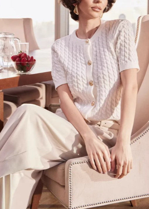 Amira - Cable Knit Button Cardigan offers a timeless blend of elegance and comfort. Featuring a classic cable-knit texture, this short-sleeve cardigan is designed with a round neckline and Gold-tone statement buttons for a refined finish. The fitted silhouette provides a flattering shape, making it perfect for layering or wearing as a chic standalone top. Crafted from a soft, breathable knit fabric, this versatile piece transitions effortlessly from casual to dressy looks. Pair it with high-waisted trousers, skirts, or denim for an effortlessly polished ensemble.