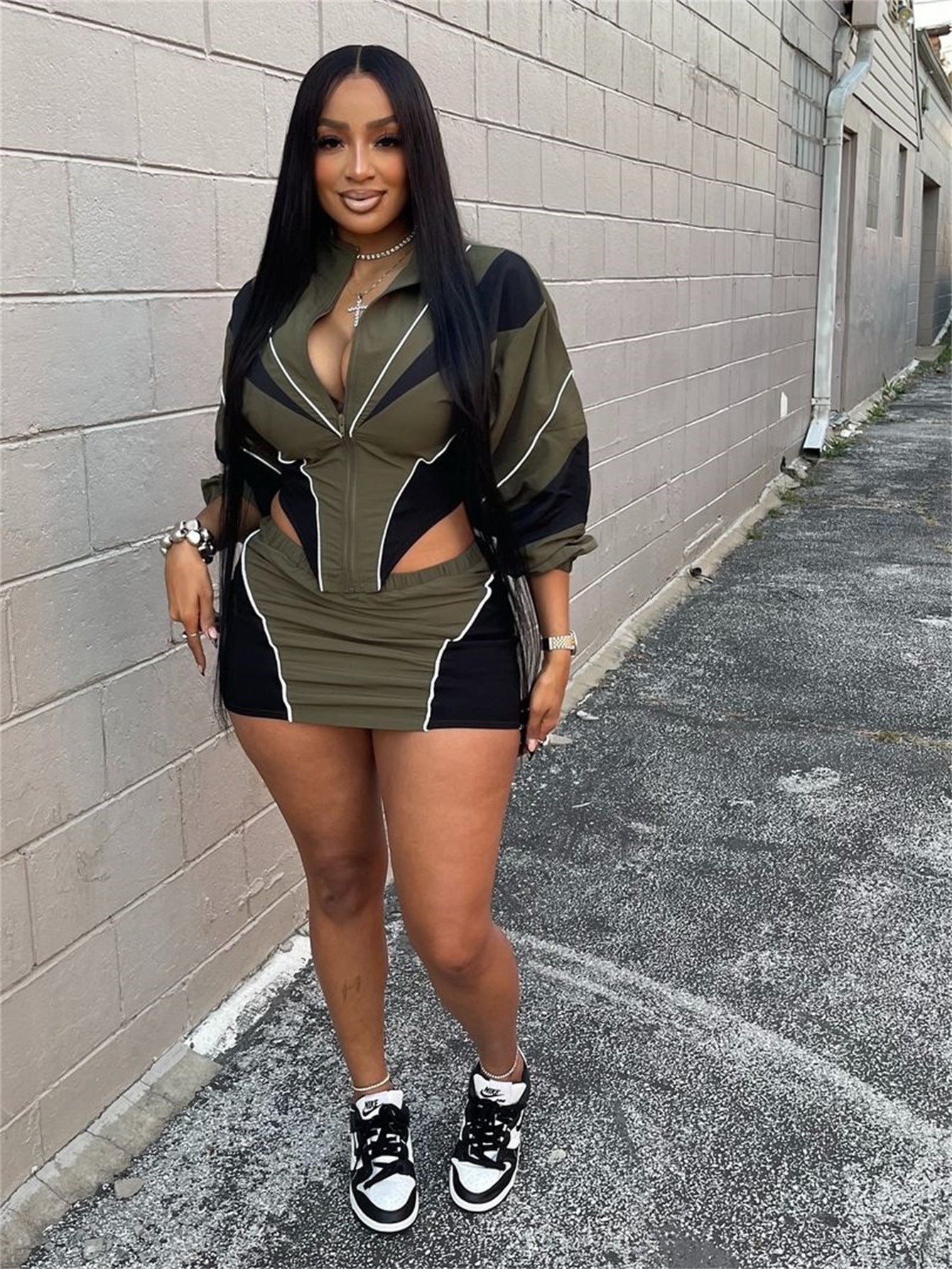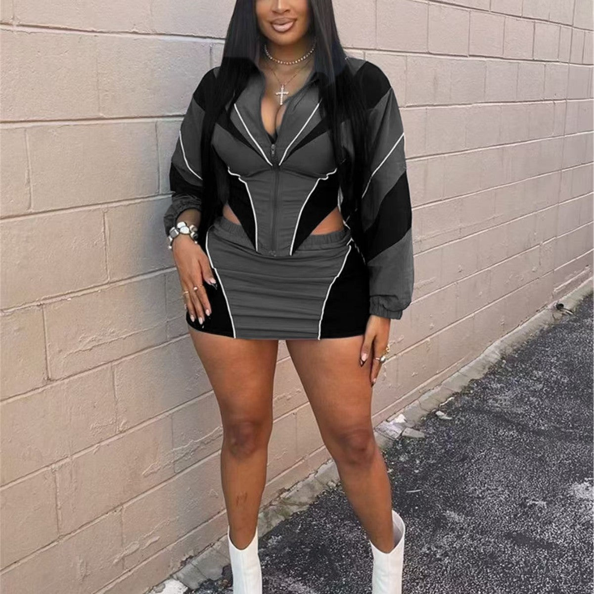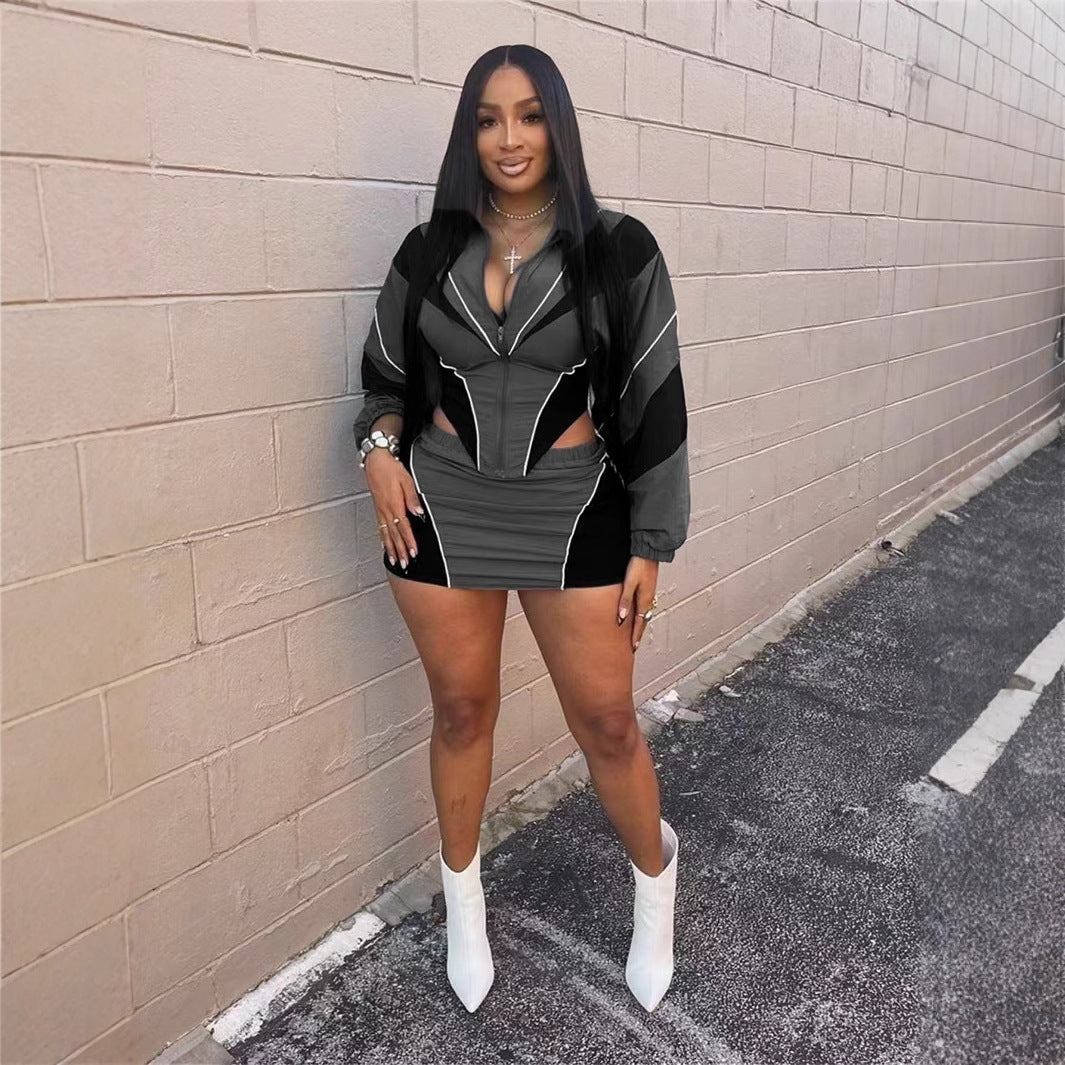 Conjunto deportivo sexy de otoño para mujer, holgado, informal, con contraste de color, de manga larga y abrigo con falda