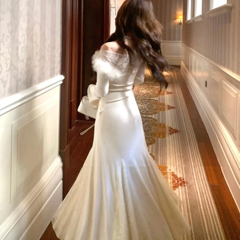 Vestidos de punto nuevos de otoño e invierno para mujer, cuello alto, manga acampanada, encaje de retazos, corte sirena, moda coreana, Vestidos para mujer