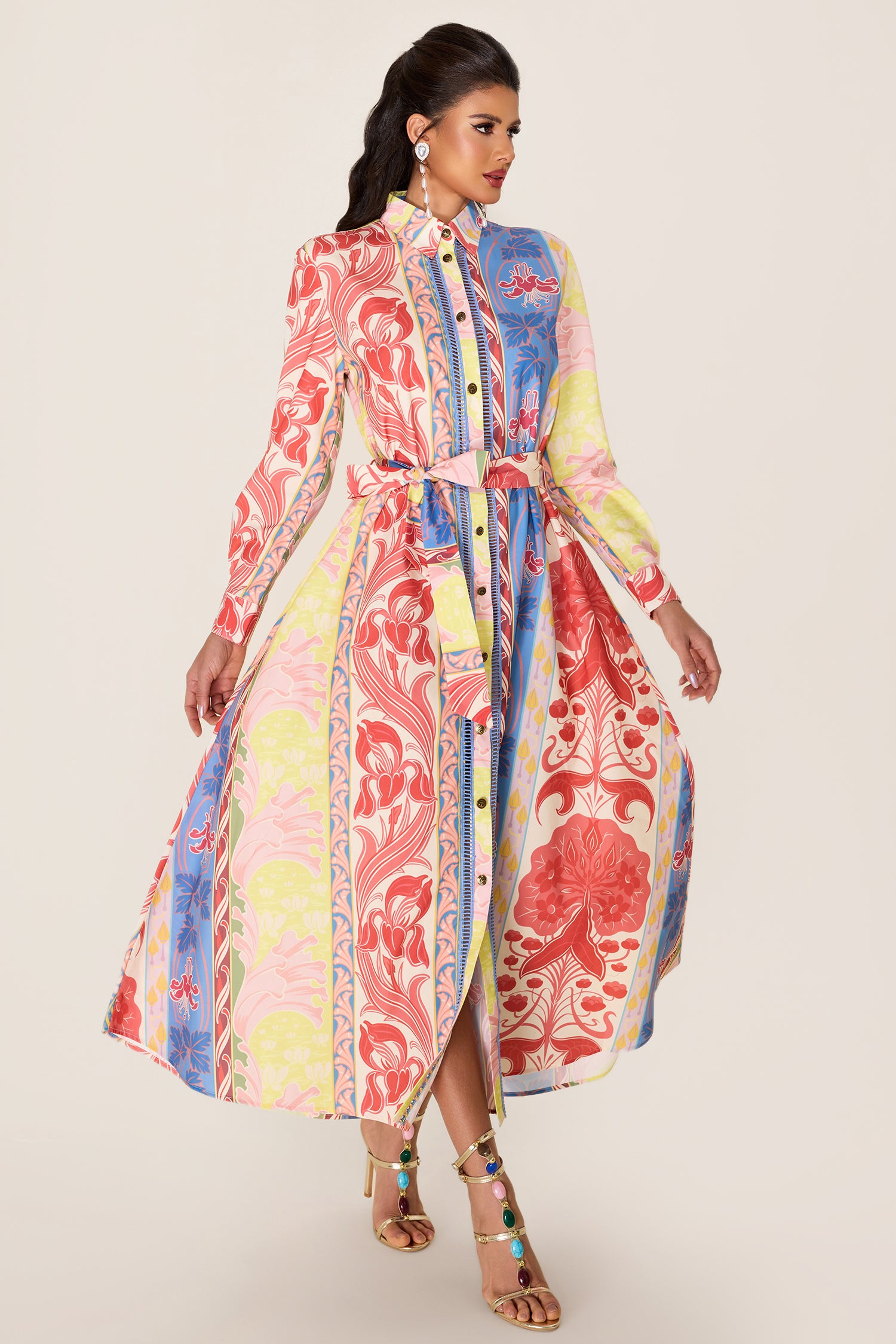 - Vestido midi de manga larga, estampado botánico, multicolor, con cinturón.