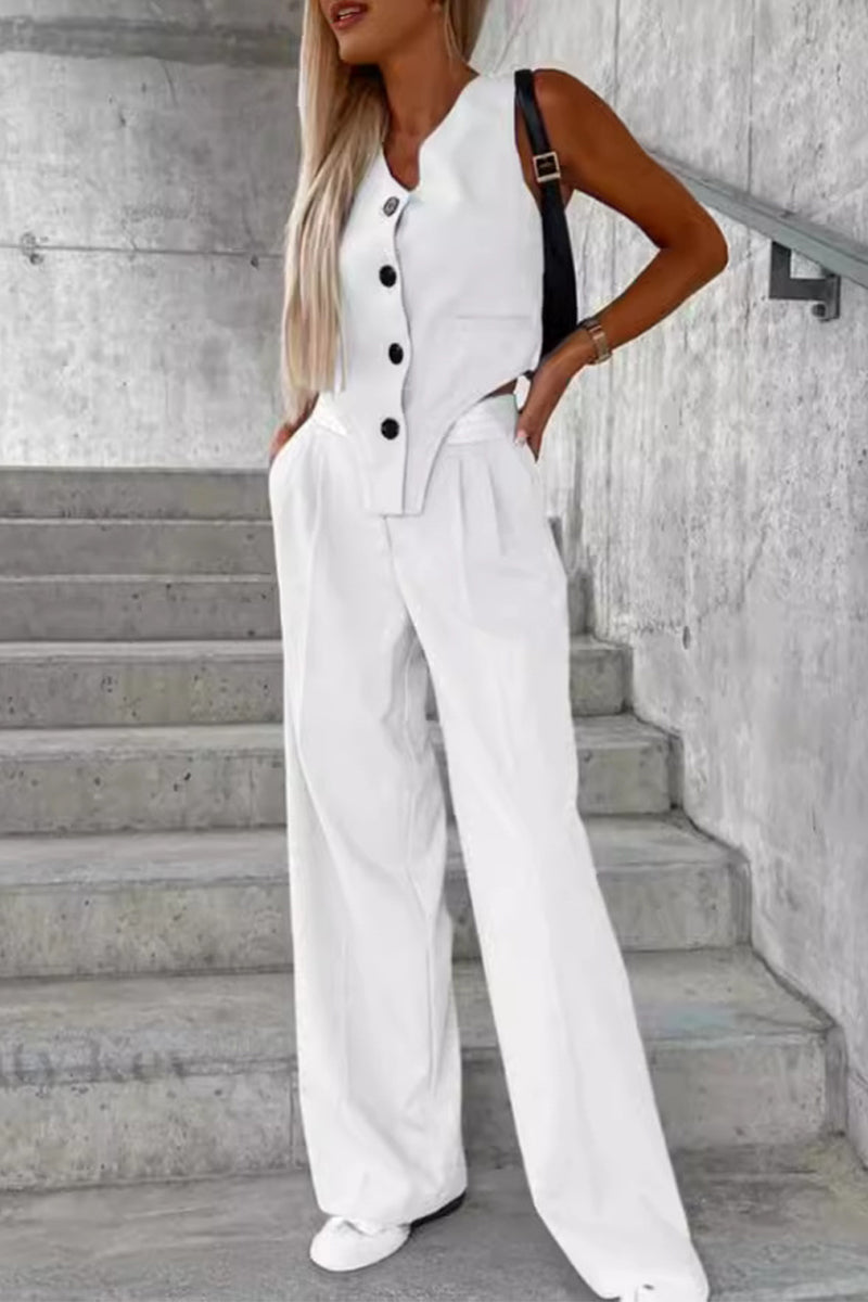 Conjunto informal de dos piezas estilo británico con botones lisos, cuello en V asimétrico, sin mangas (8 colores)