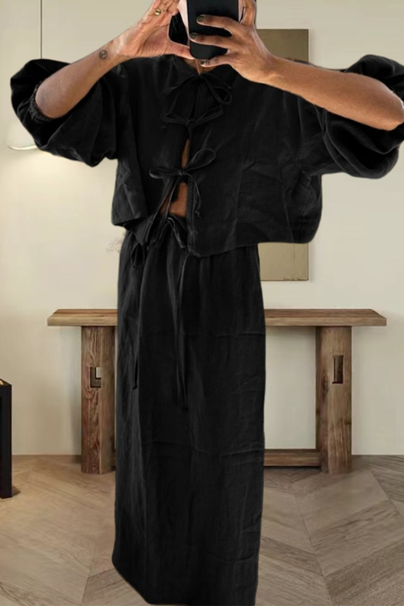 Conjunto informal de dos piezas con cuello redondo, manga larga, color liso, con cordones (4 colores)