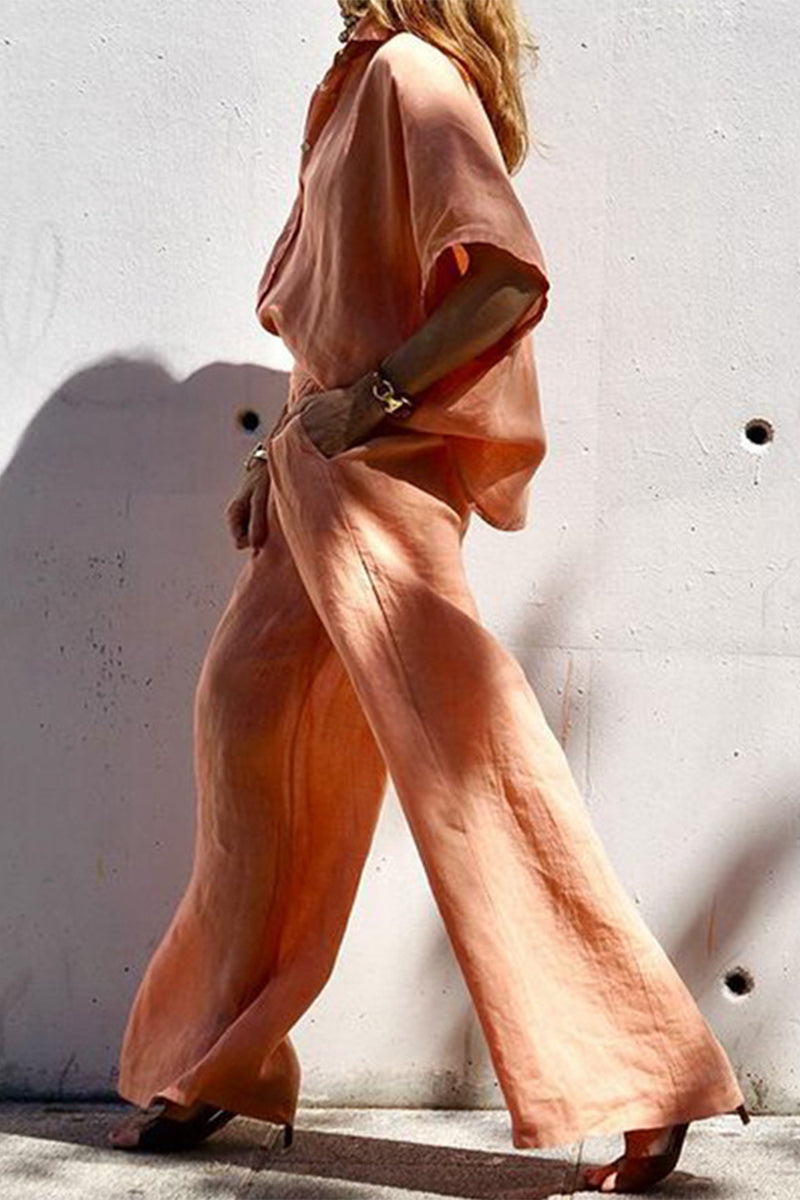Conjunto informal de dos piezas con cuello vuelto, manga corta y bolsillos en color liso para uso diario