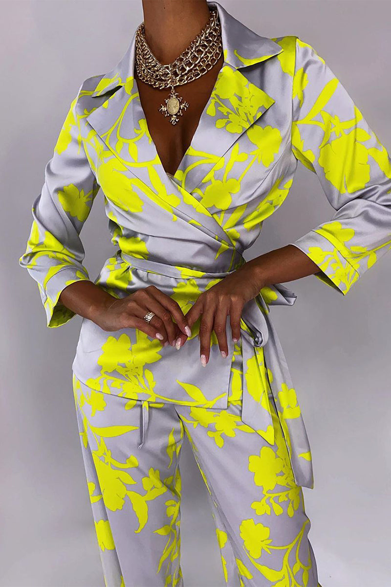 Conjunto de dos piezas informal con estampado floral, cordones, cuello vuelto en contraste, manga larga