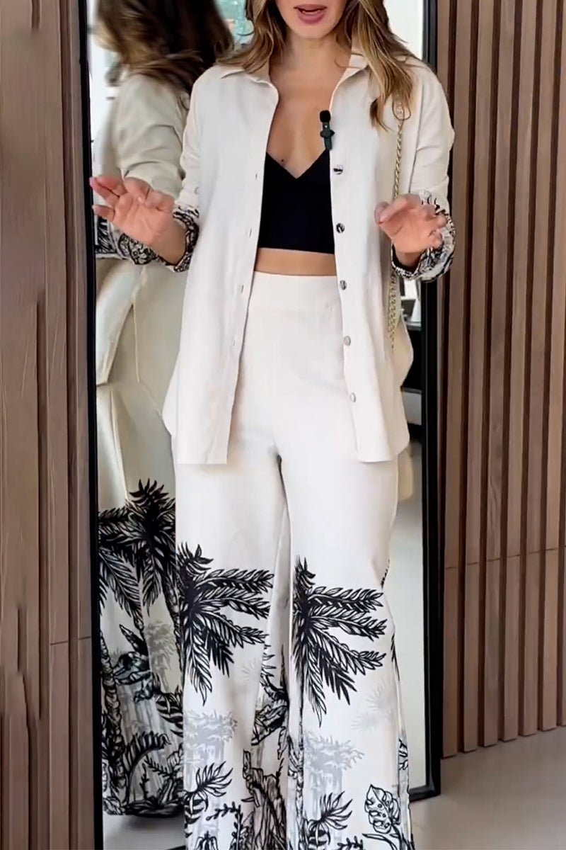 Conjunto de dos piezas con estampado de paisaje informal, botones, cuello vuelto, manga larga