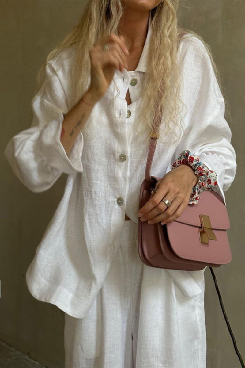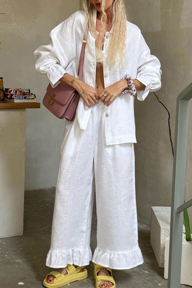 Conjunto informal de dos piezas con cuello vuelto, manga larga y volantes con hebilla sólida
