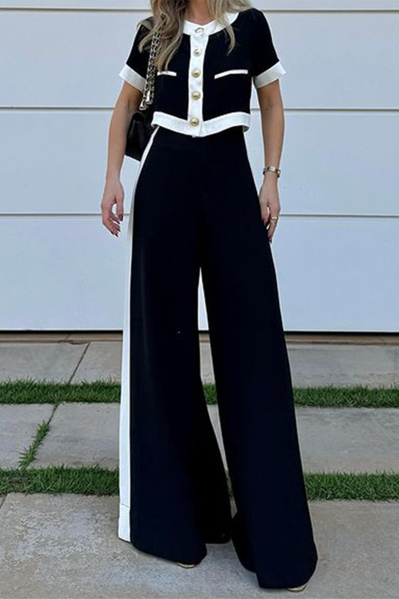 Conjunto informal de dos piezas de manga corta con botones en contraste de color liso para calle