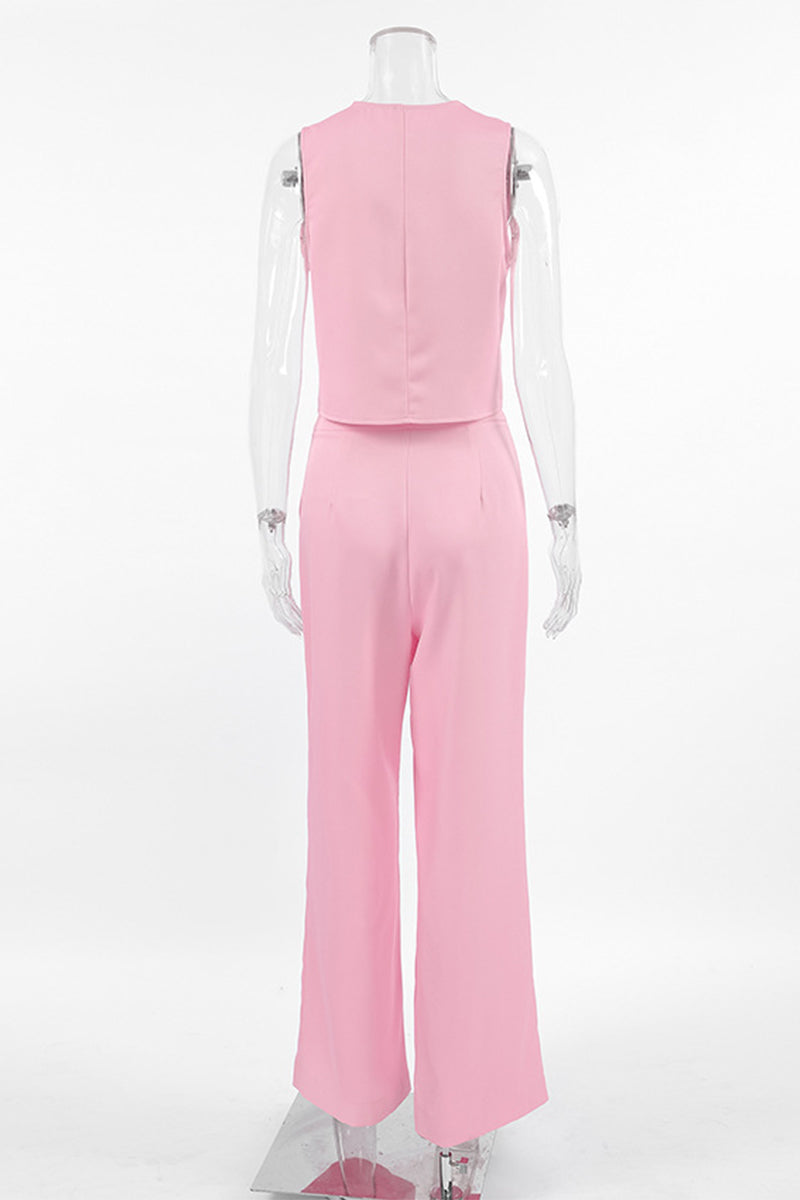 Conjunto informal de dos piezas con cuello en V, sin mangas, bolsillos, botones y bolsillos lisos para la calle