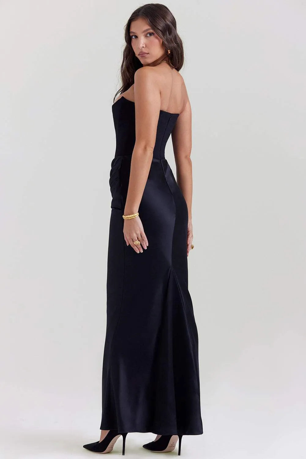 Vestido midi liso sin tirantes con corsé