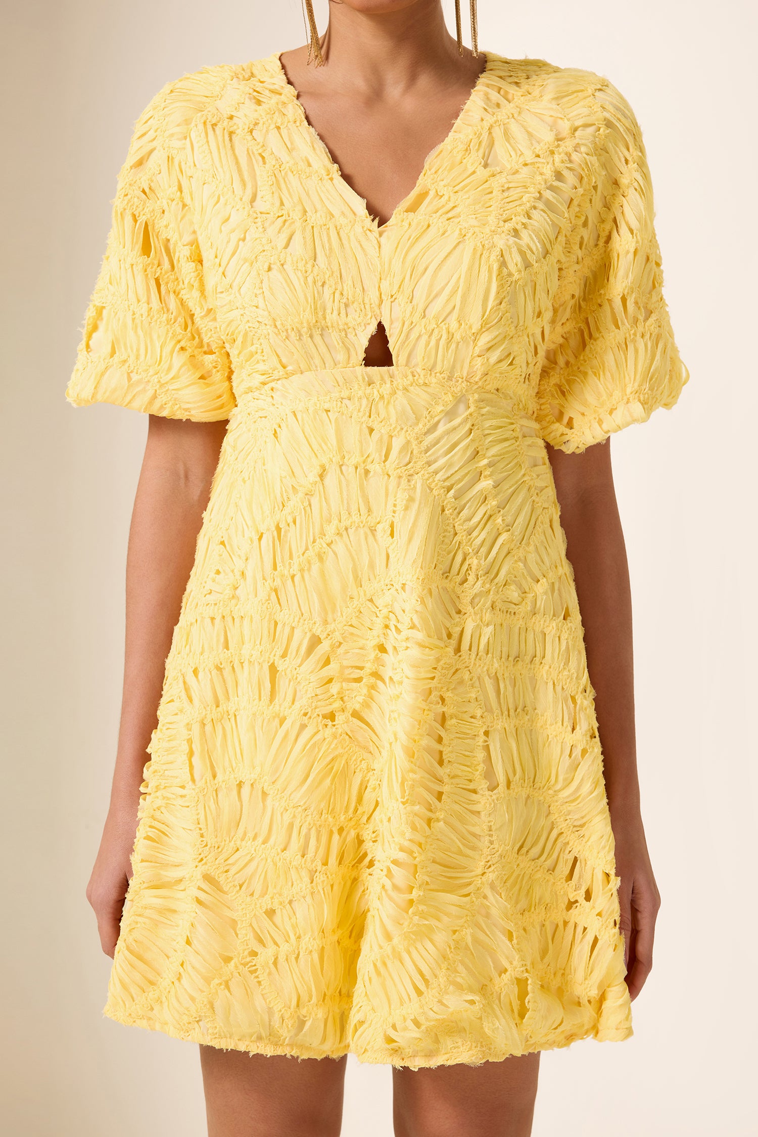 - Color sólido, manga media, amarillo, minivestido, encaje, corte, manga abullonada, escote en pico
