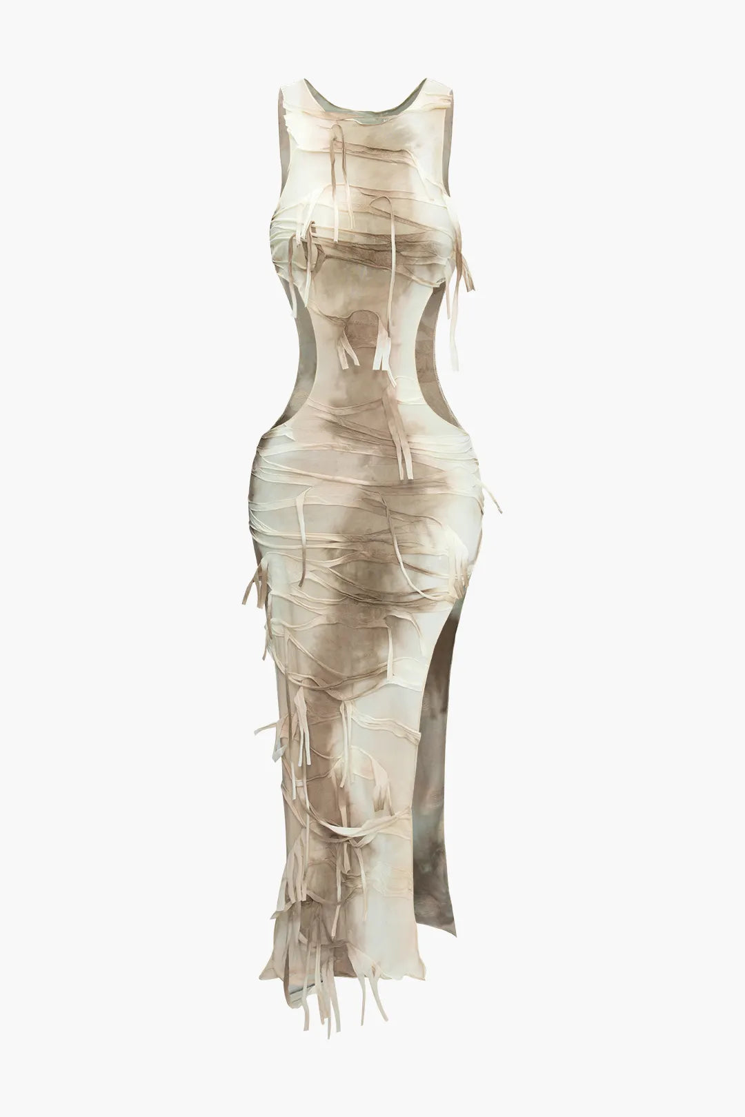Cynthia Beige and Brown Tie Dye Distressed Cut Out Slit Maxi Dress