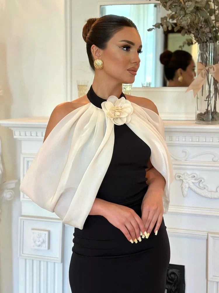Boost your confidence and elegance with our Dayanara Midi Dress. Featuring a sexy off the shoulder halter neck and 3D flower design, this black backless dress will make you stand out at any evening party. The pleat sleeves and bodycon fit add a touch of sophistication to this elegant piece. Expertly crafted for a flawless look.