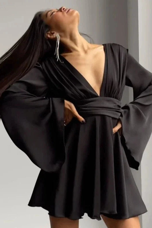 This elegant mini dress features a deep V neck and stylish flare sleeves. designed with a flattering high waist for a chic silhouette. Perfect for special occasions or a night out.