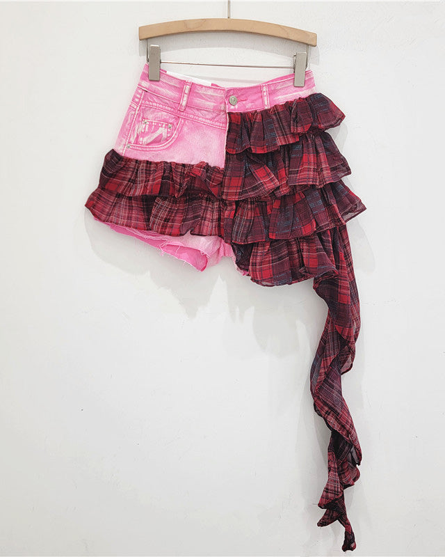 Denim Patchwork Short Irregular Chiffon Cake Skirt