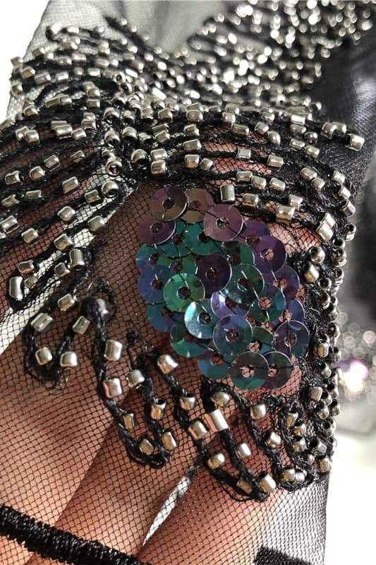 - Manga larga, transparente, plumas bordadas, cuello con detalles de cuentas.