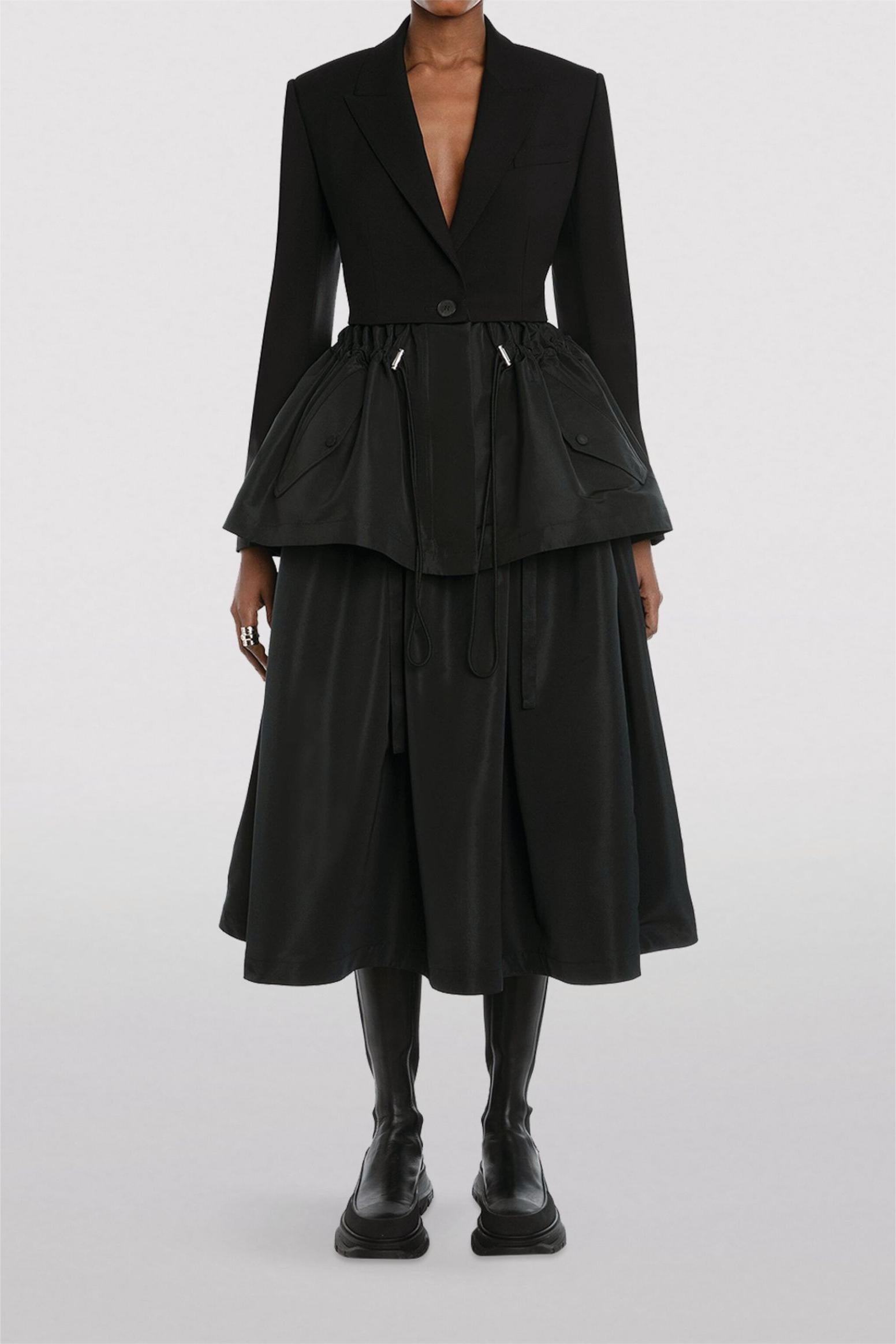 - Blazer negro con cordón y volantes en el bajo