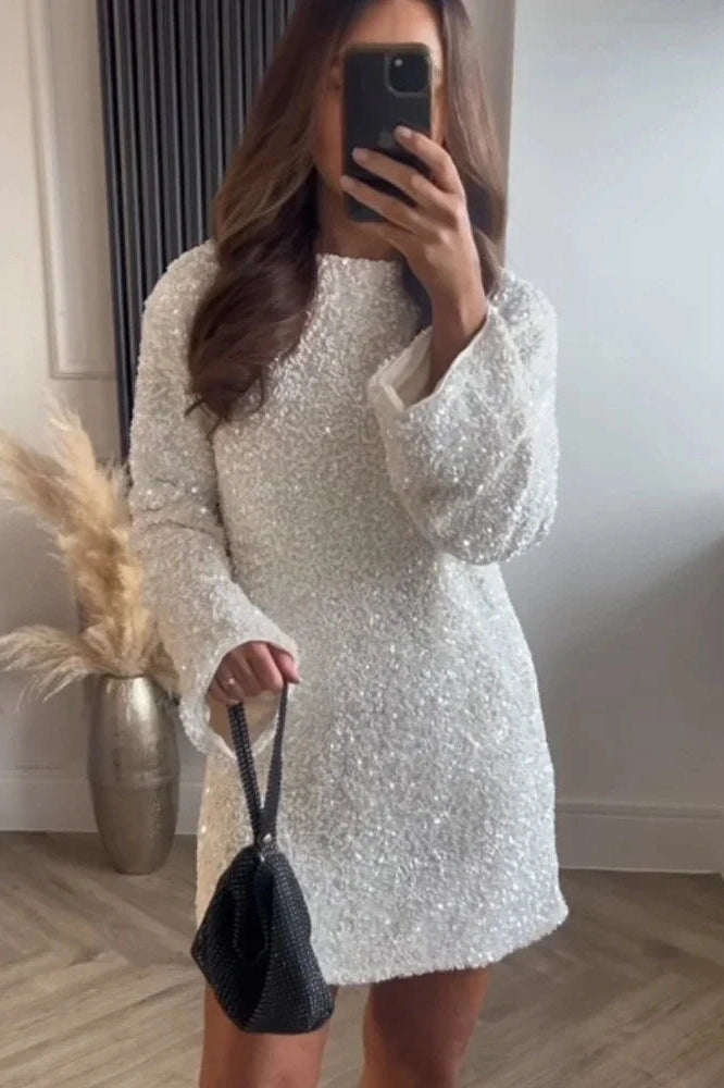 This mini dress features a high waist and long sleeves. delivering a sophisticated and flattering silhouette.
