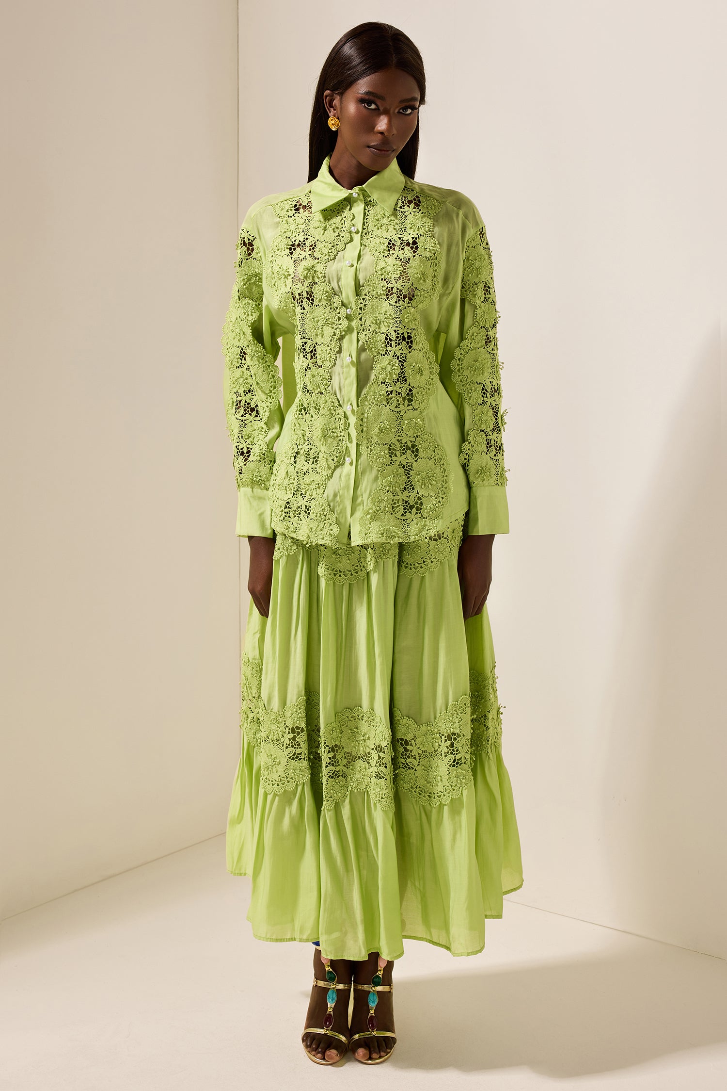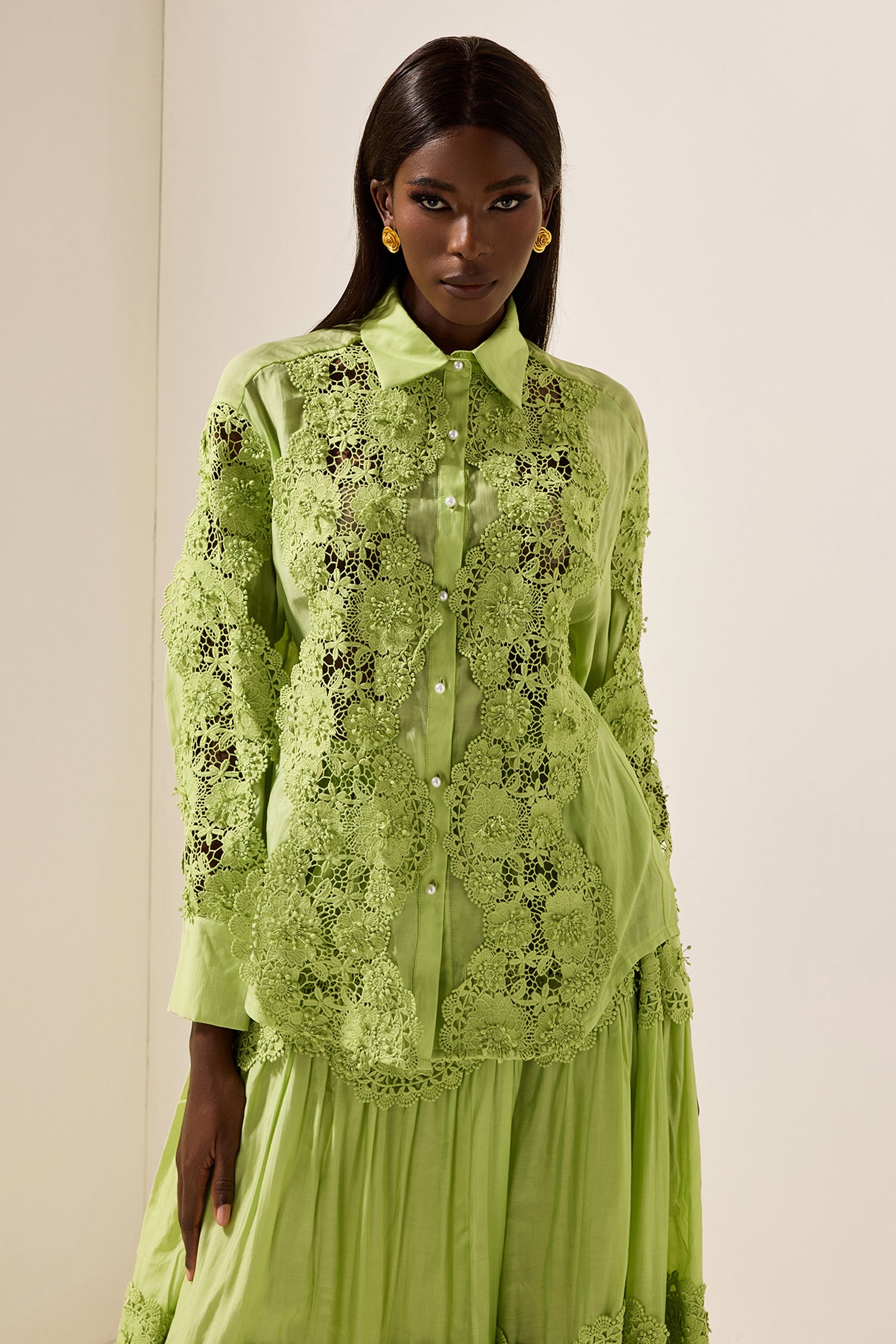 - Manga larga, color liso, verde, encaje, top, bordado, cintura media, falda midi