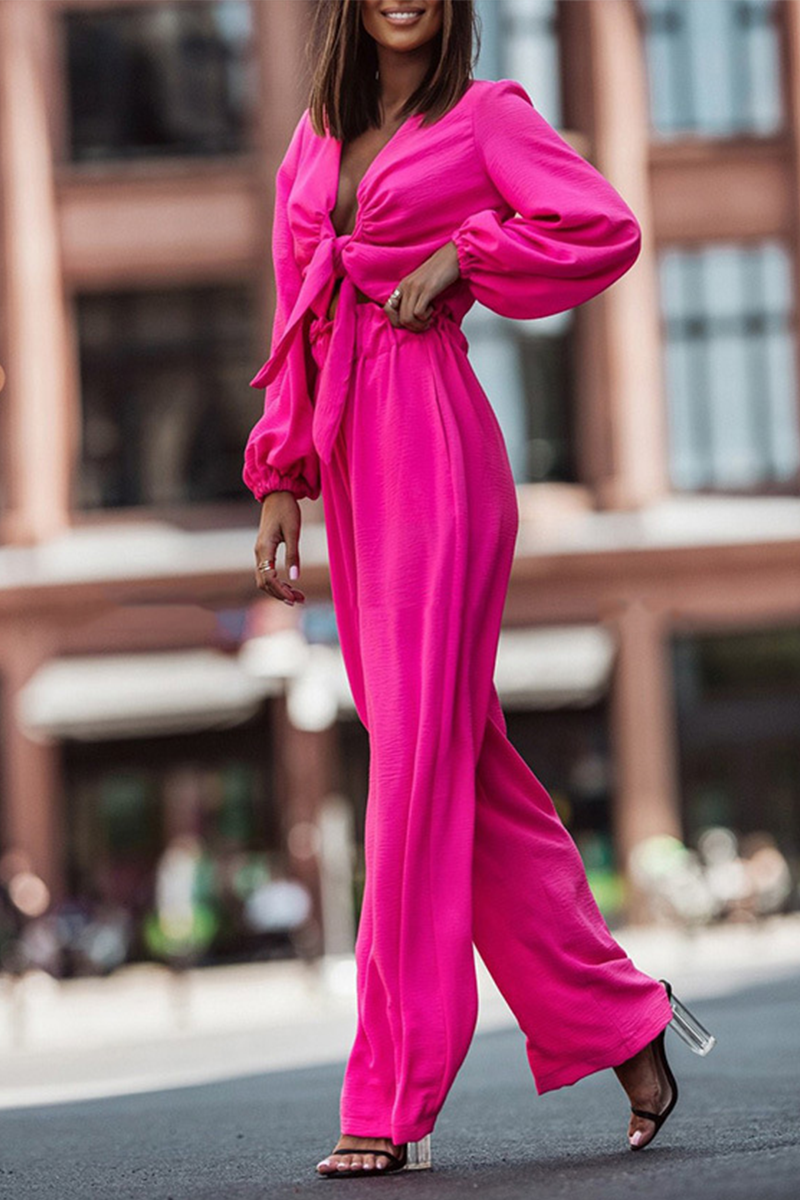 Conjunto de dos piezas con escote en V, manga larga y vendaje liso (6 colores)