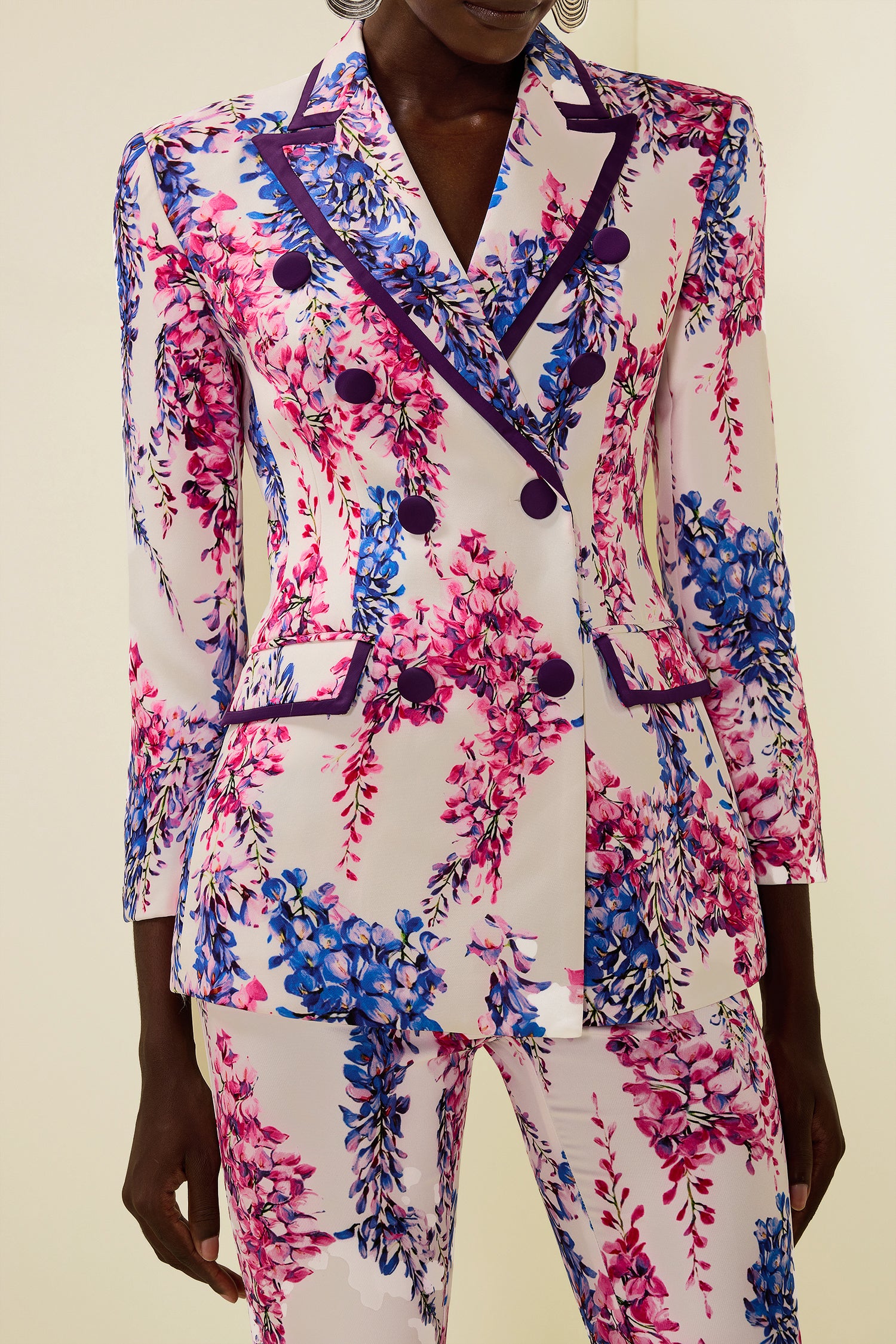 - Blazer cruzado con estampado floral y cintura alta, conjunto morado.