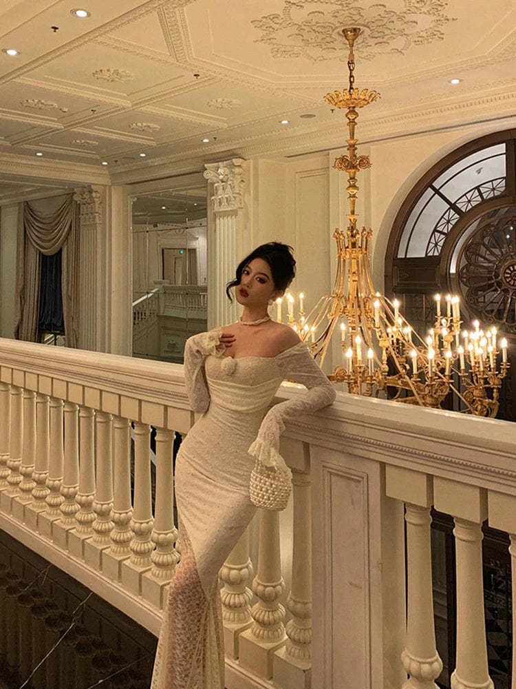 Elevate your style with our Marisol Maxi Dress. This white lace dress features a delicate fishtail design, floral corsage details, and ruched sheer long sleeves for a touch of medieval retro charm. Perfect for any occasion, this one-piece dress will have you feeling elegant and desired.