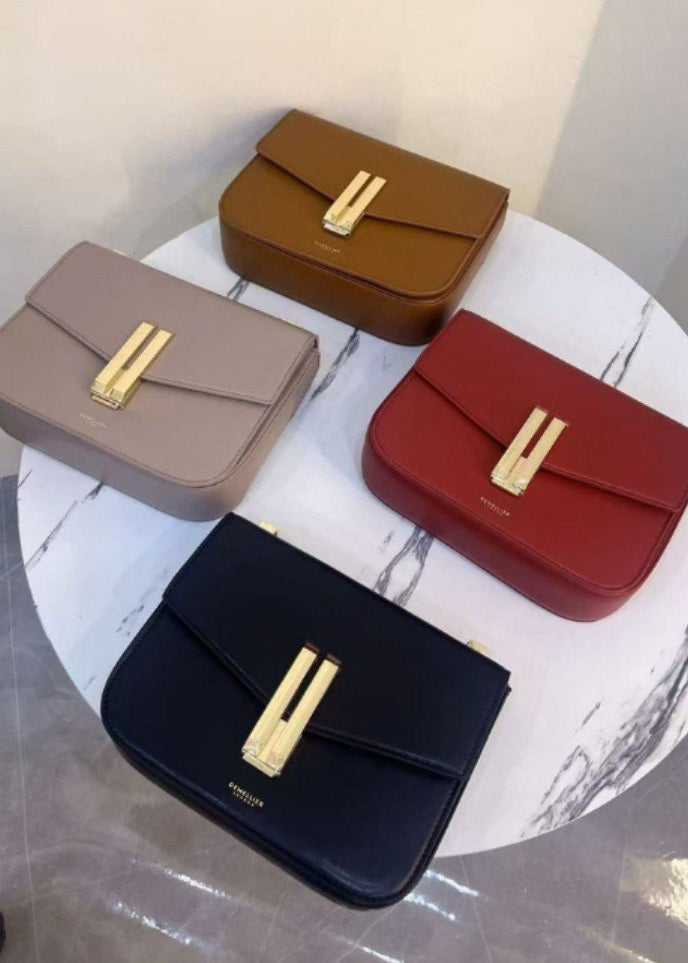 Noir Axis is a modern structured shoulder bag crafted from smooth black leather with a refined matte finish. The geometric flap design is secured by a striking gold-tone clasp that adds a sophisticated contrast. It features a cotton-lined interior with a slip pocket and a hidden zip pocket for secure storage. The adjustable strap offers versatility for shoulder or crossbody wear.