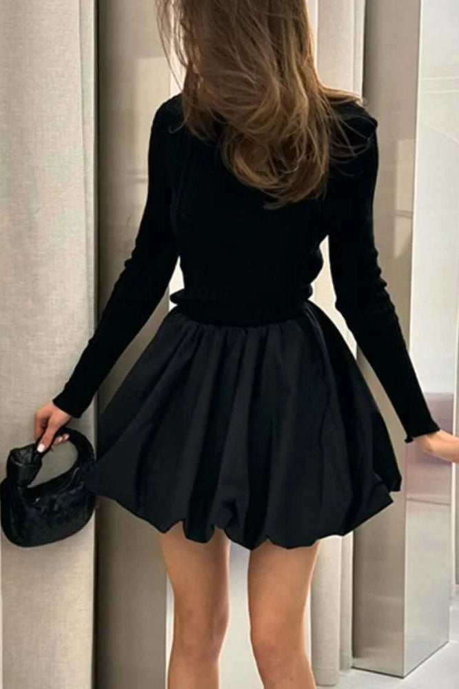 A stylish mini dress with an O-neck. high waist. and long sleeves. offering a chic and flattering silhouette.