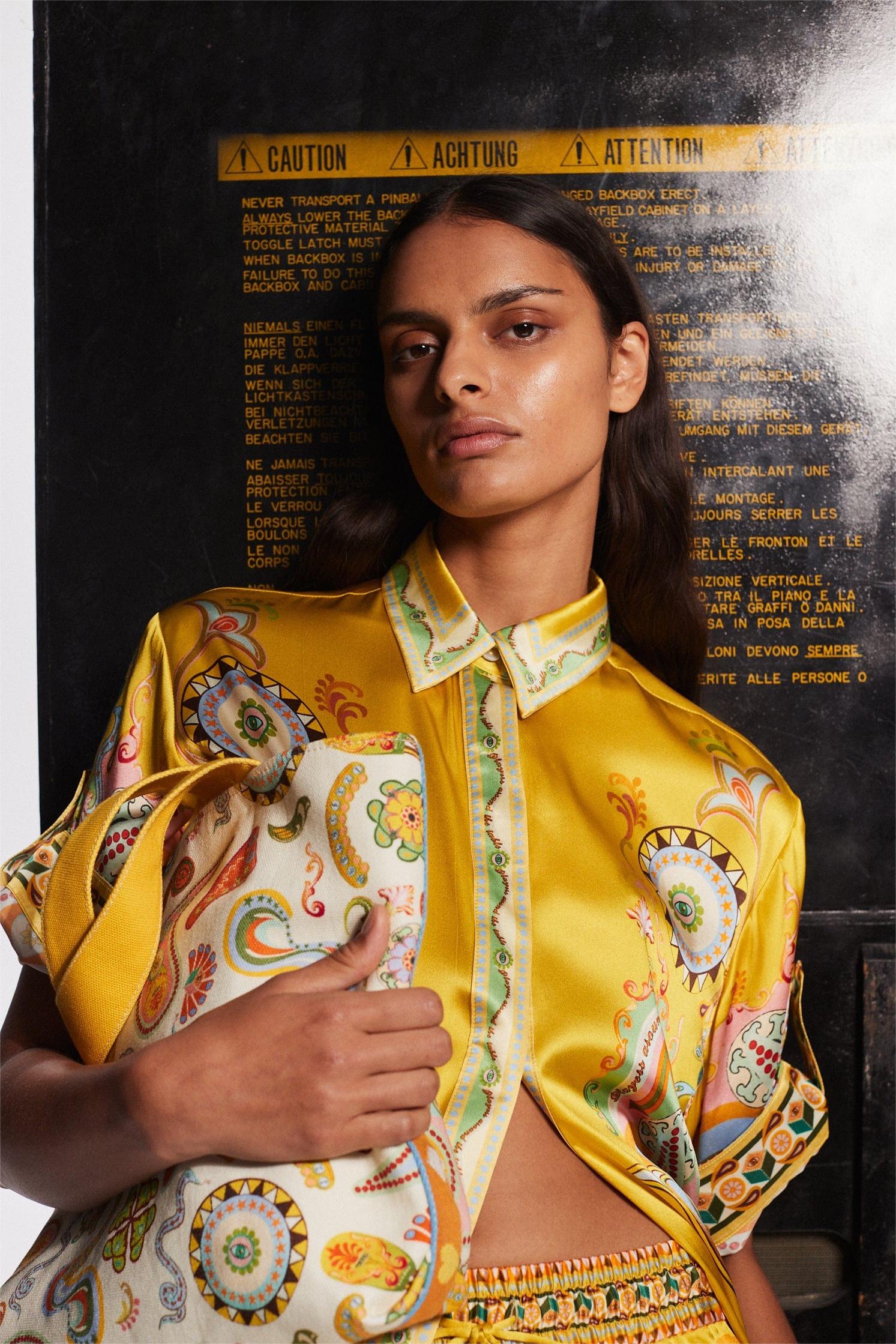- Estampado paisley, satén, parte inferior, parte superior, cintura media, conjuntos, amarillo