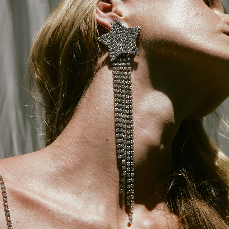 Rhinestone Star Long Fringe Drop Earrings Silver