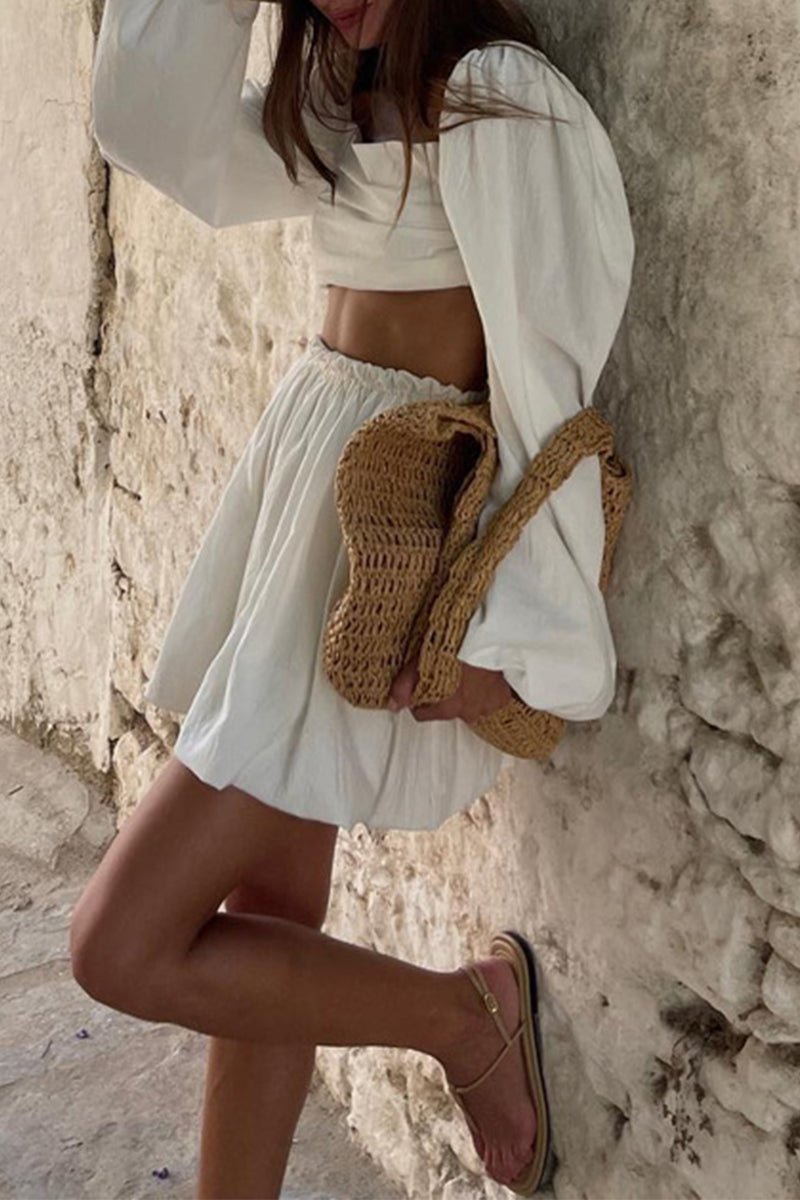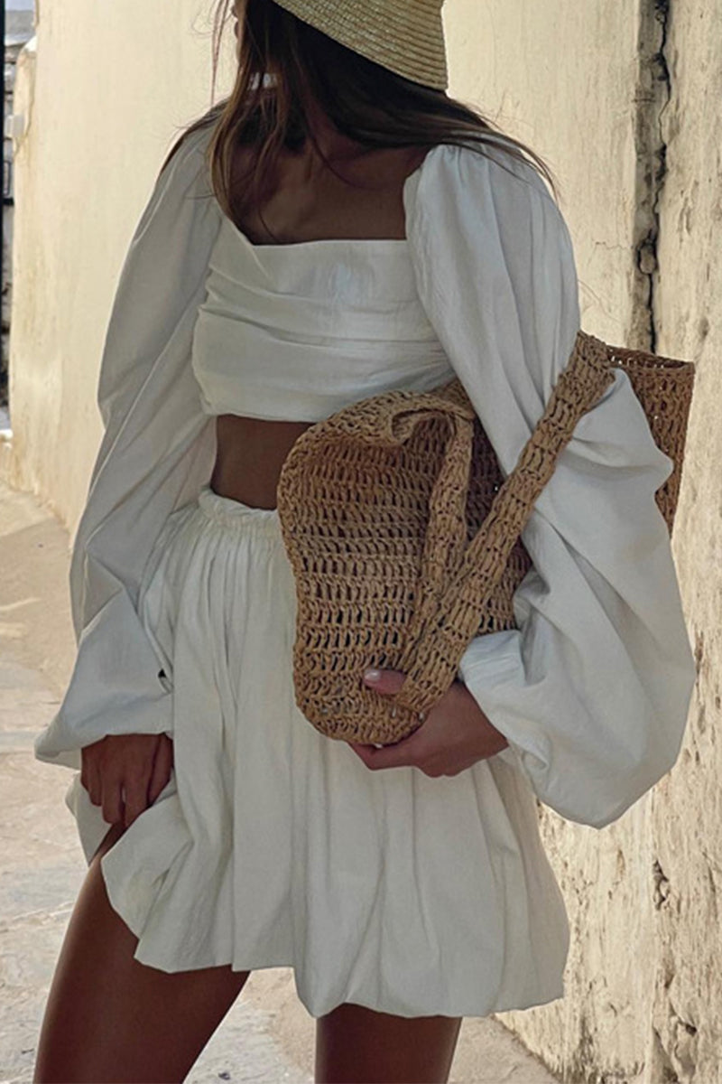 Conjunto de dos piezas sexy de manga larga con cuello cuadrado y pliegues de frenillo liso