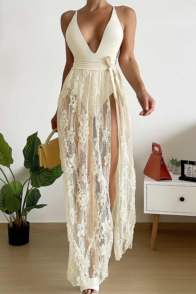 Traje de baño sexy de malla con abertura en el frenillo sólido para vacaciones (dos piezas)