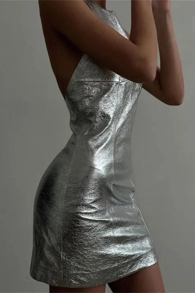 Embrace sophistication with Fashion Silver Backless Mini Dress. Crafted from PU material. this slim dress features a captivating zipper design and exudes high street elegance.