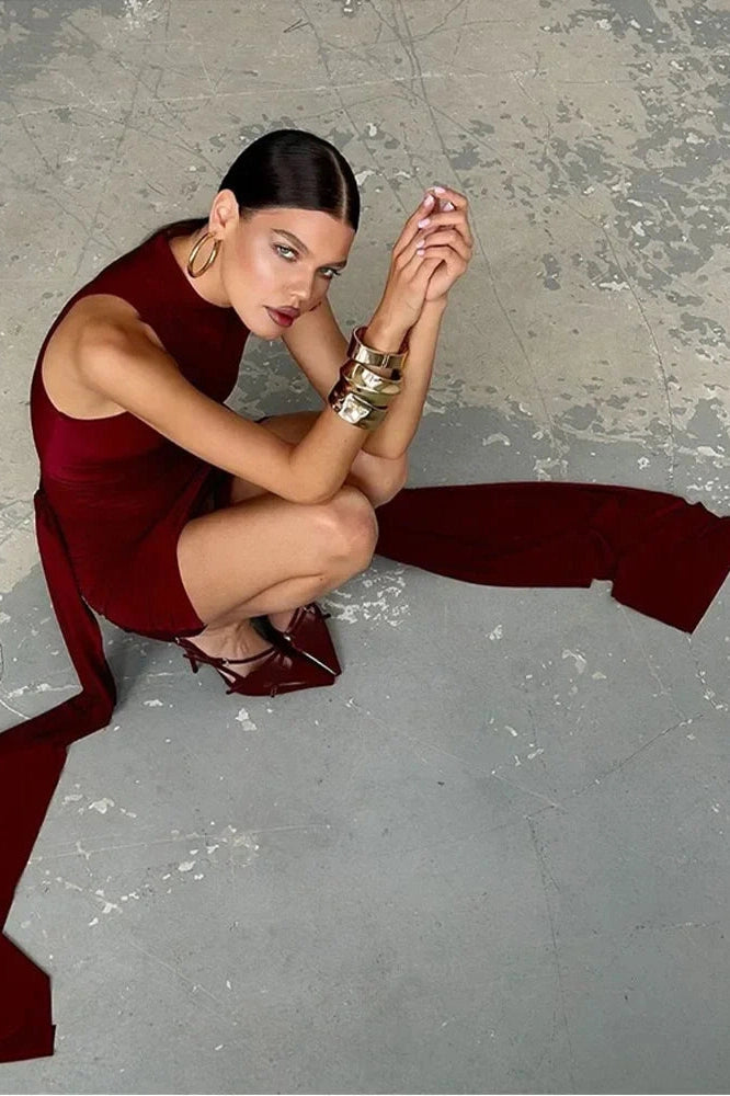This slim fit sleeveless dress features an O-neckline and a stylish ribbon-crossed pleated design for a chic look.