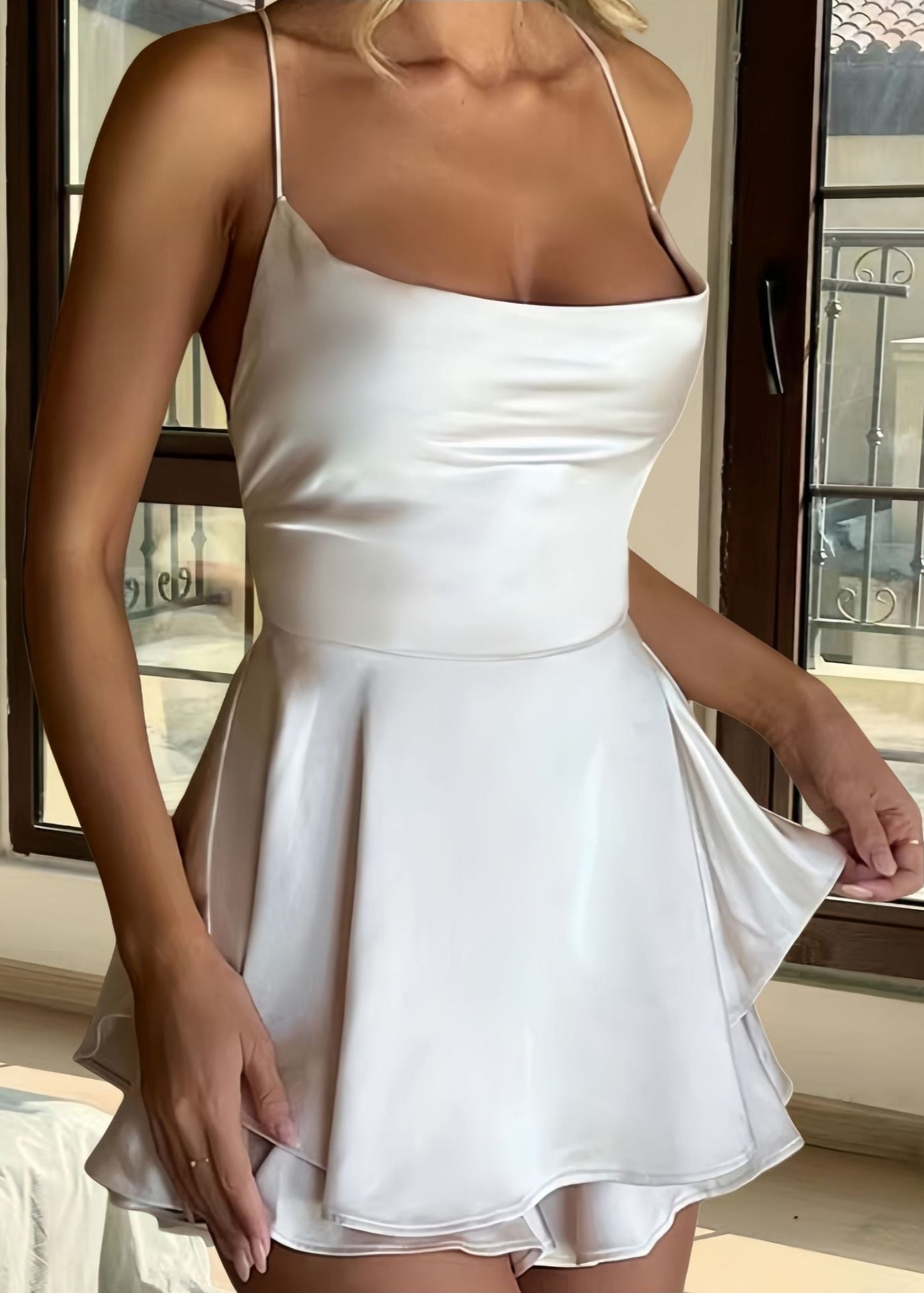 Soleil - Satin Lace-Up Ruffle Romper is the perfect blend of elegance and playfulness. Designed with a flattering cowl neckline and delicate spaghetti straps, this romper drapes effortlessly over the body. The open-back lace-up detail adds a sultry touch, while the layeRed ruffle hem creates a flowy, feminine silhouette. Made from a silky satin fabric, it catches the light beautifully, making it ideal for summer vacations, sunset parties, and special occasions. Pair it with strappy heels or minimalist sandals for a chic, effortless look.
