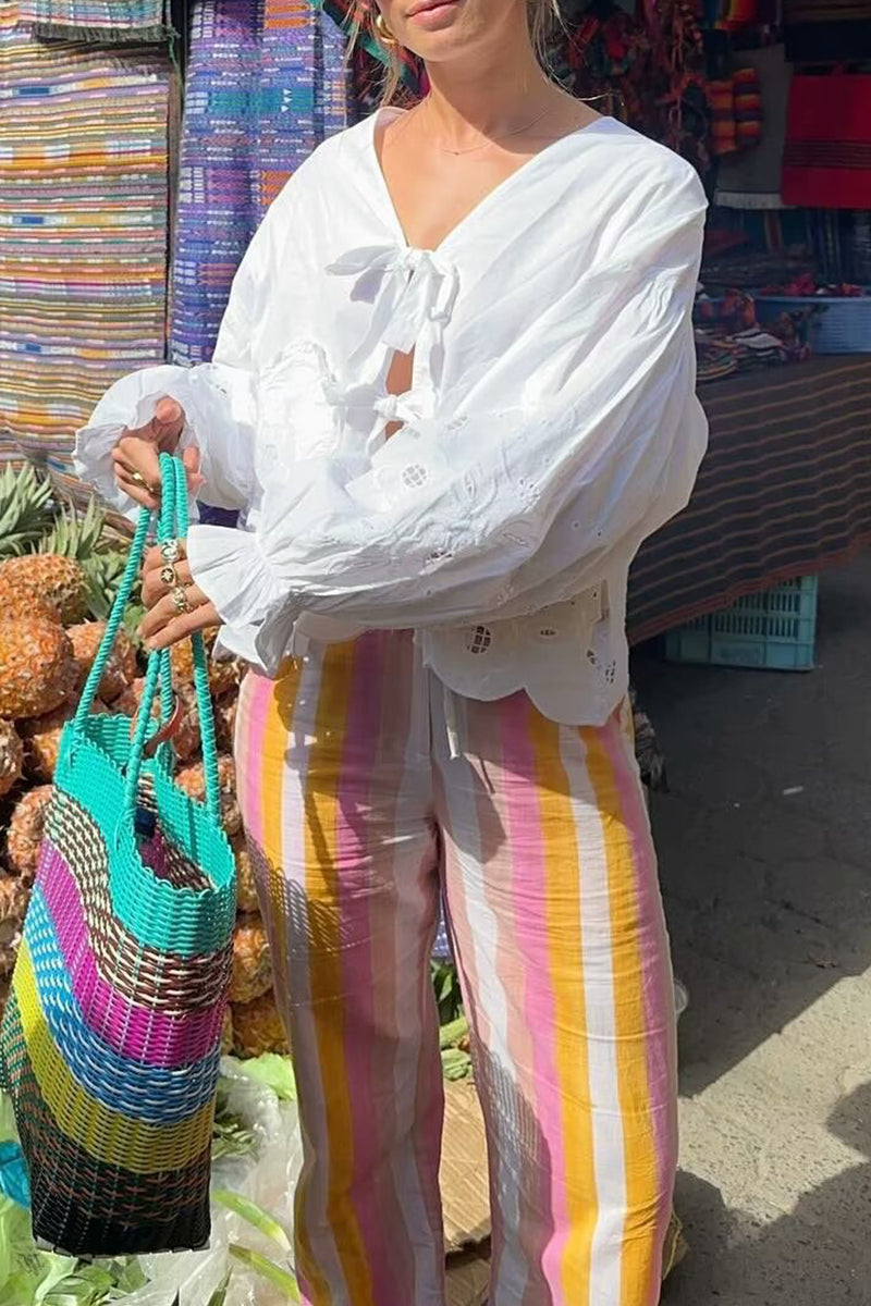 Blusas dulces de cuello en V con frenillo ahuecado y bordado sólido