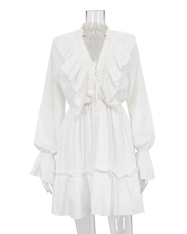 V-Neck Smocked Bell-Sleeved Ruffled White Mini Dress
