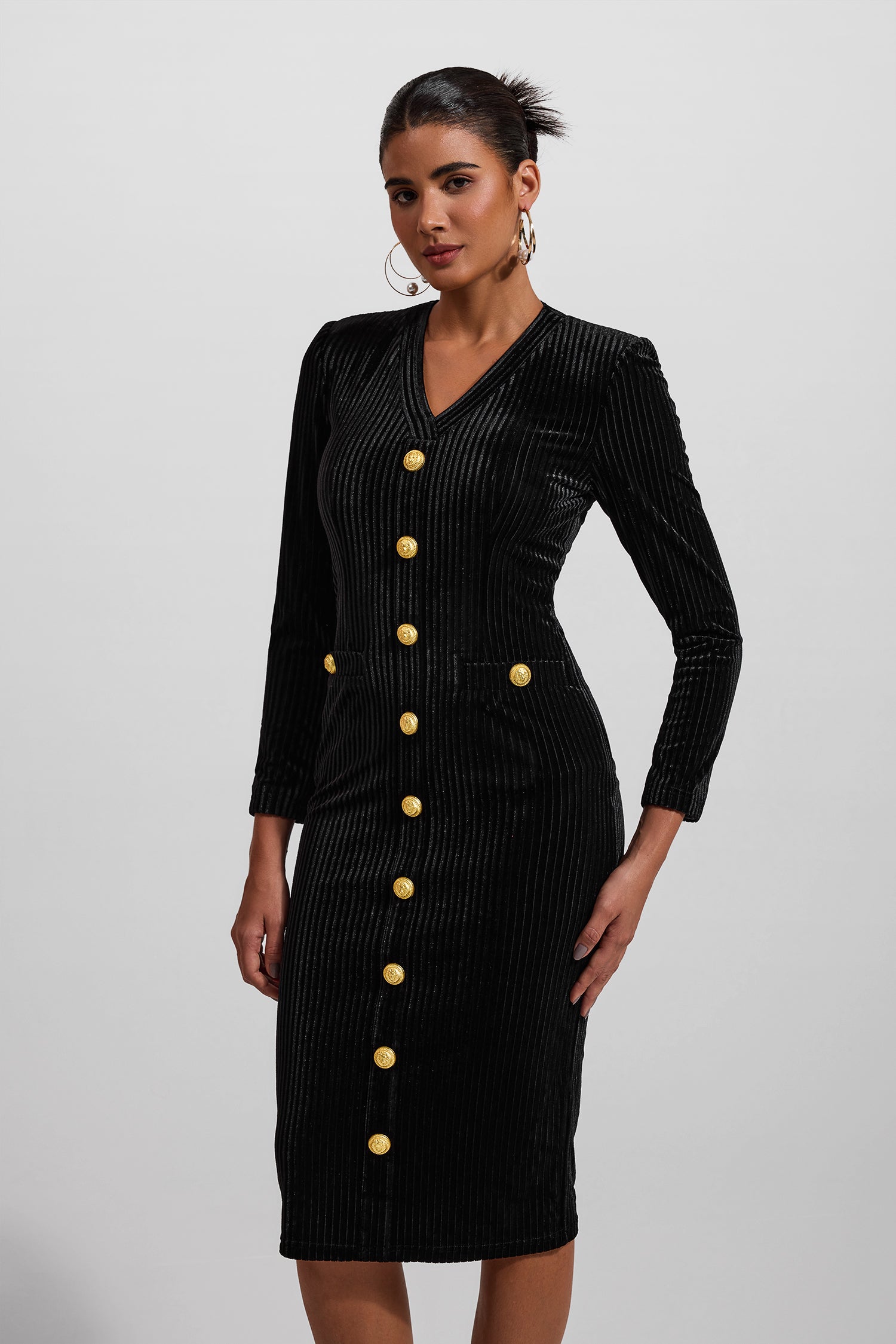 - Vestido midi negro de terciopelo, escote en pico y botones metálicos, manga larga.