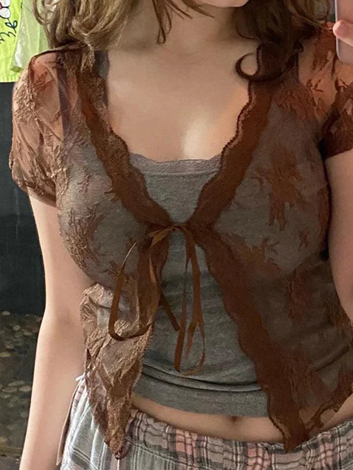Y2K Open Front Lace Long Sleeve Crop Blouse
