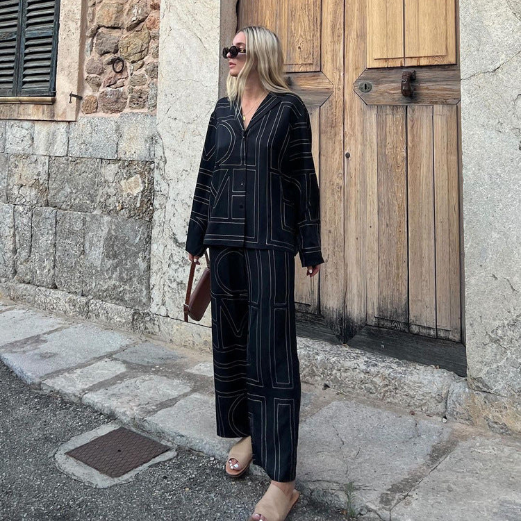 Autumn Letter Graphic Print Satin Long Sleeve Collared Shirt Elastic Trousers Casual Suit Women Clothing