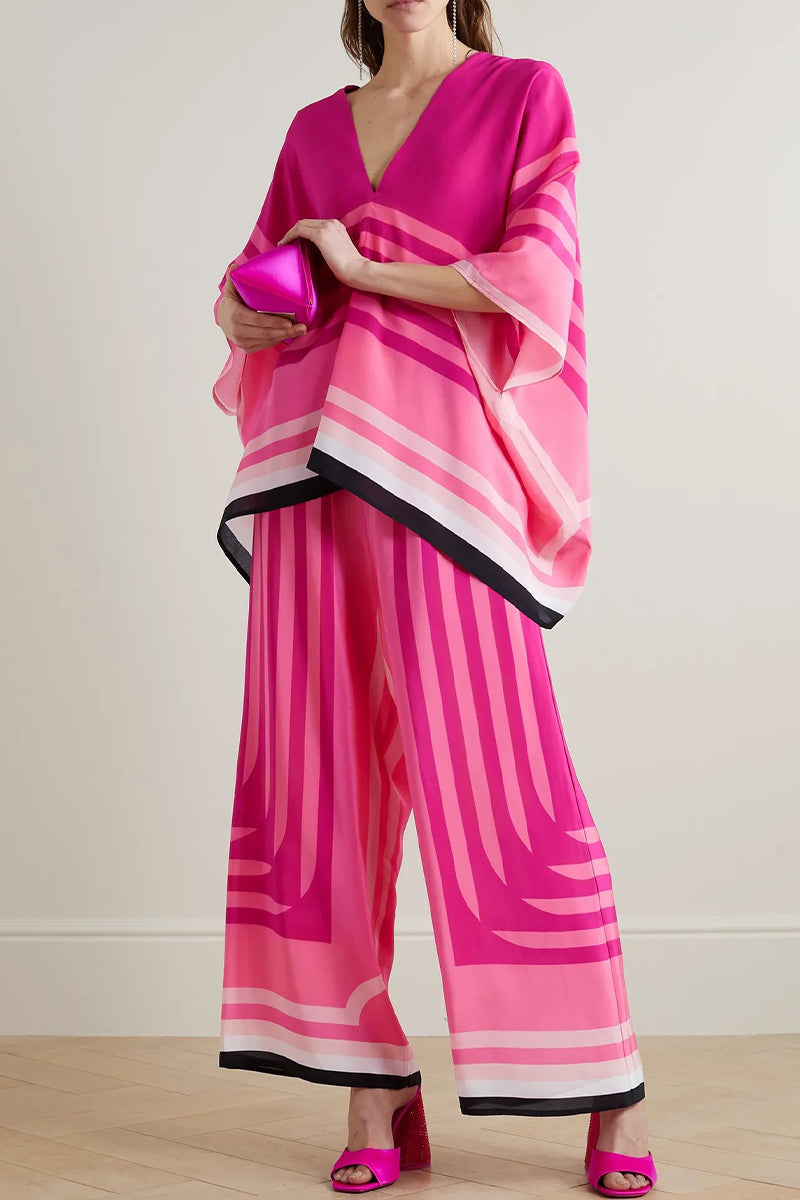 Casual British Style Geometric Print Patchwork V Neck Nine Points Sleeve Two Pieces
