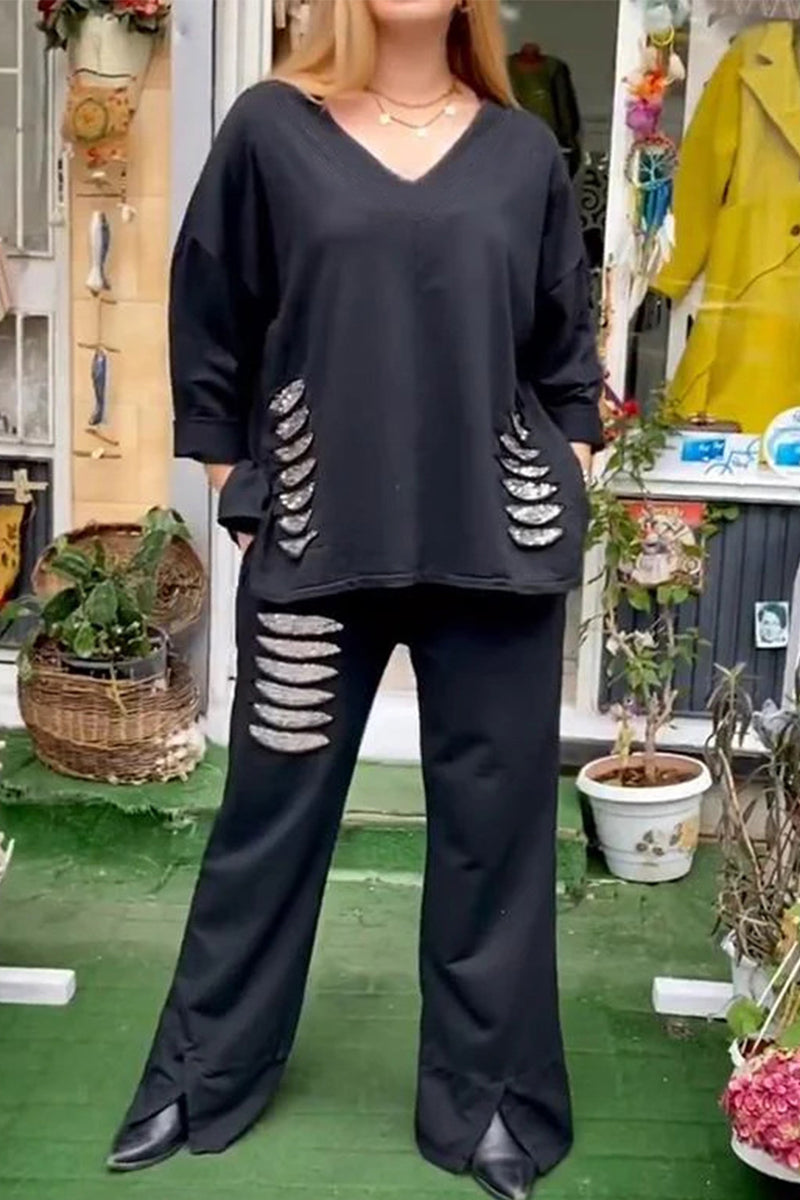 Casual Daily Ripped Sequins Irregular V Neck Half Sleeve Two Pieces(8 Colors)