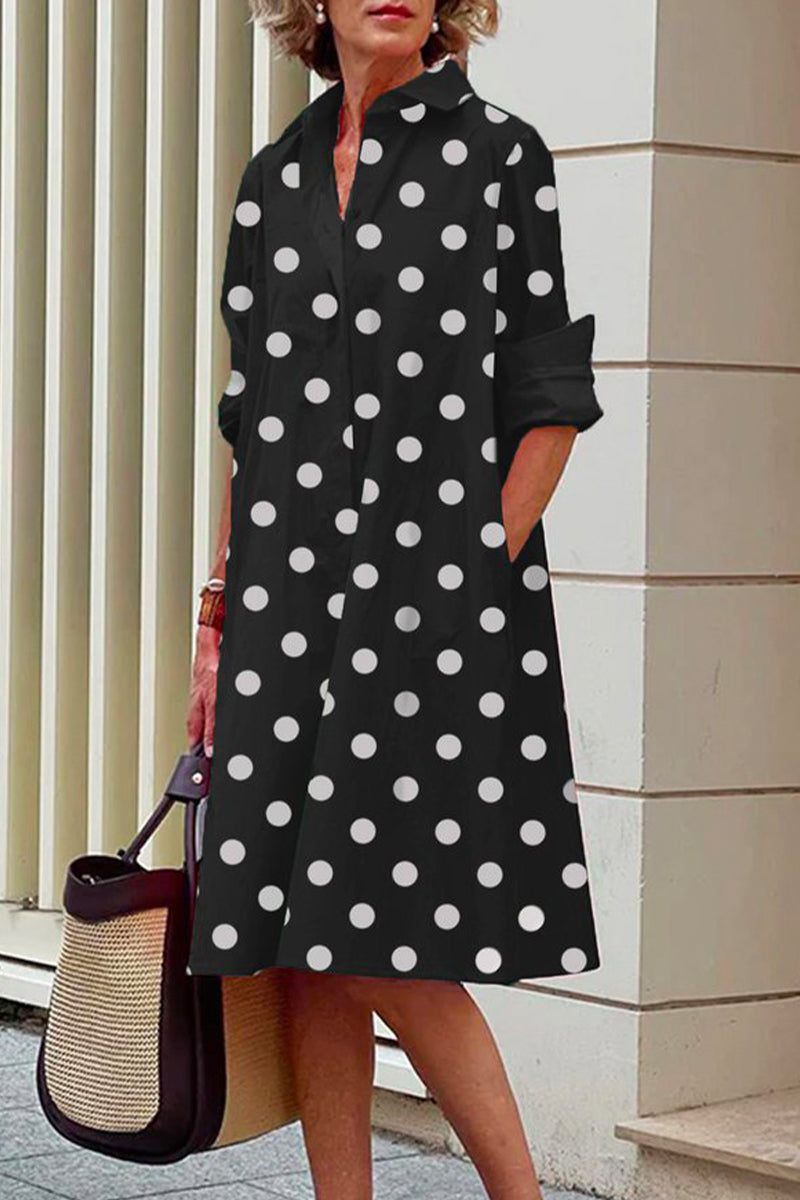 Casual Polka Dot Pocket Contrast Turndown Collar A Line Dresses(10 Colors)
