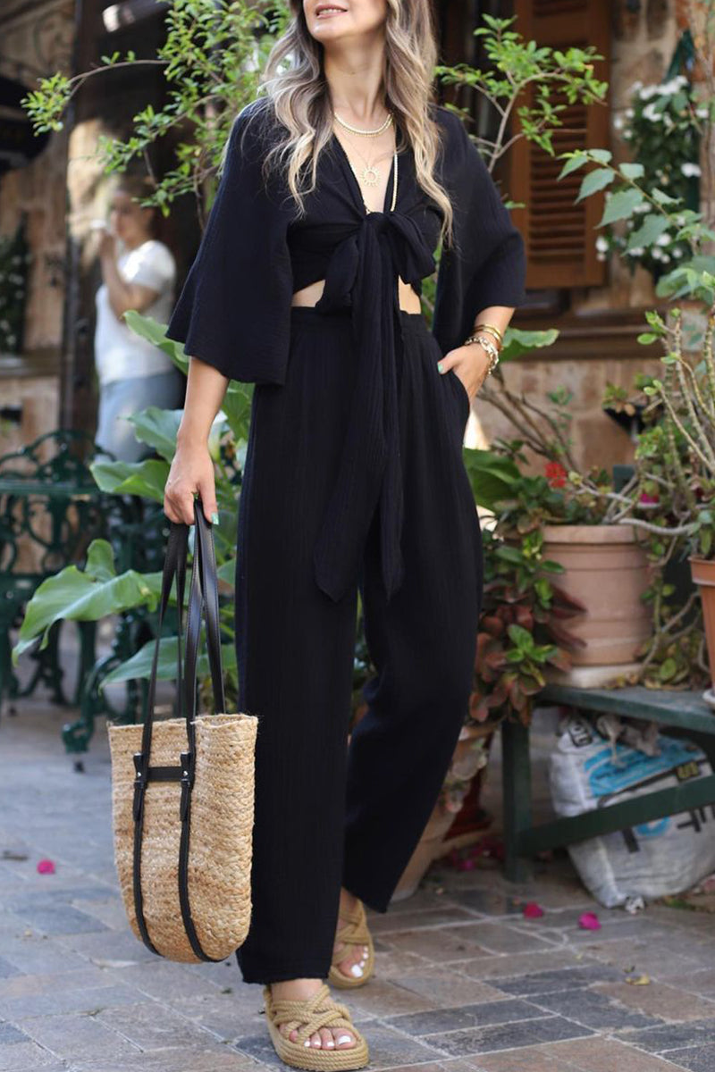 Casual Solid Frenulum V Neck Half Sleeve Two Pieces