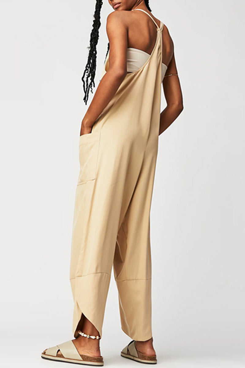 Casual Solid Pocket V Neck Loose Jumpsuits