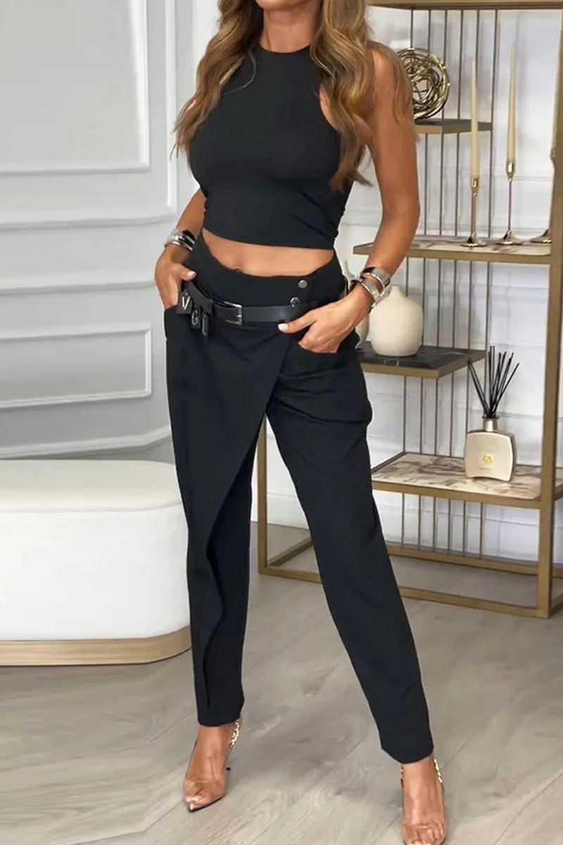 Casual Street Pocket With Belt O Neck Sleeveless Two Pieces