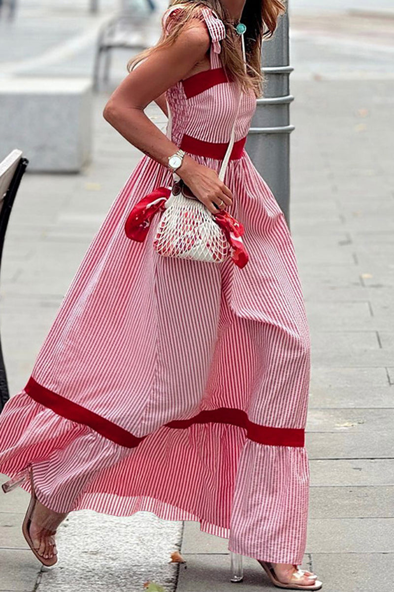 Casual Street Striped Print Lace Up Patchwork Contrast Square Neck Sling Dresses