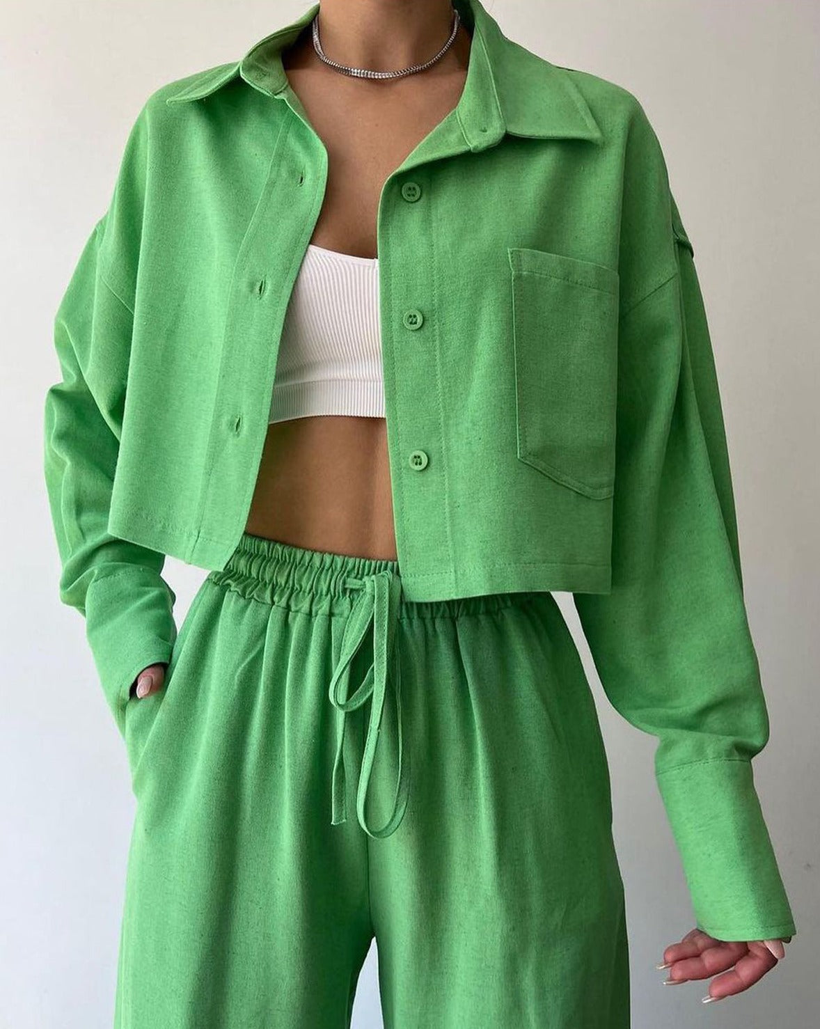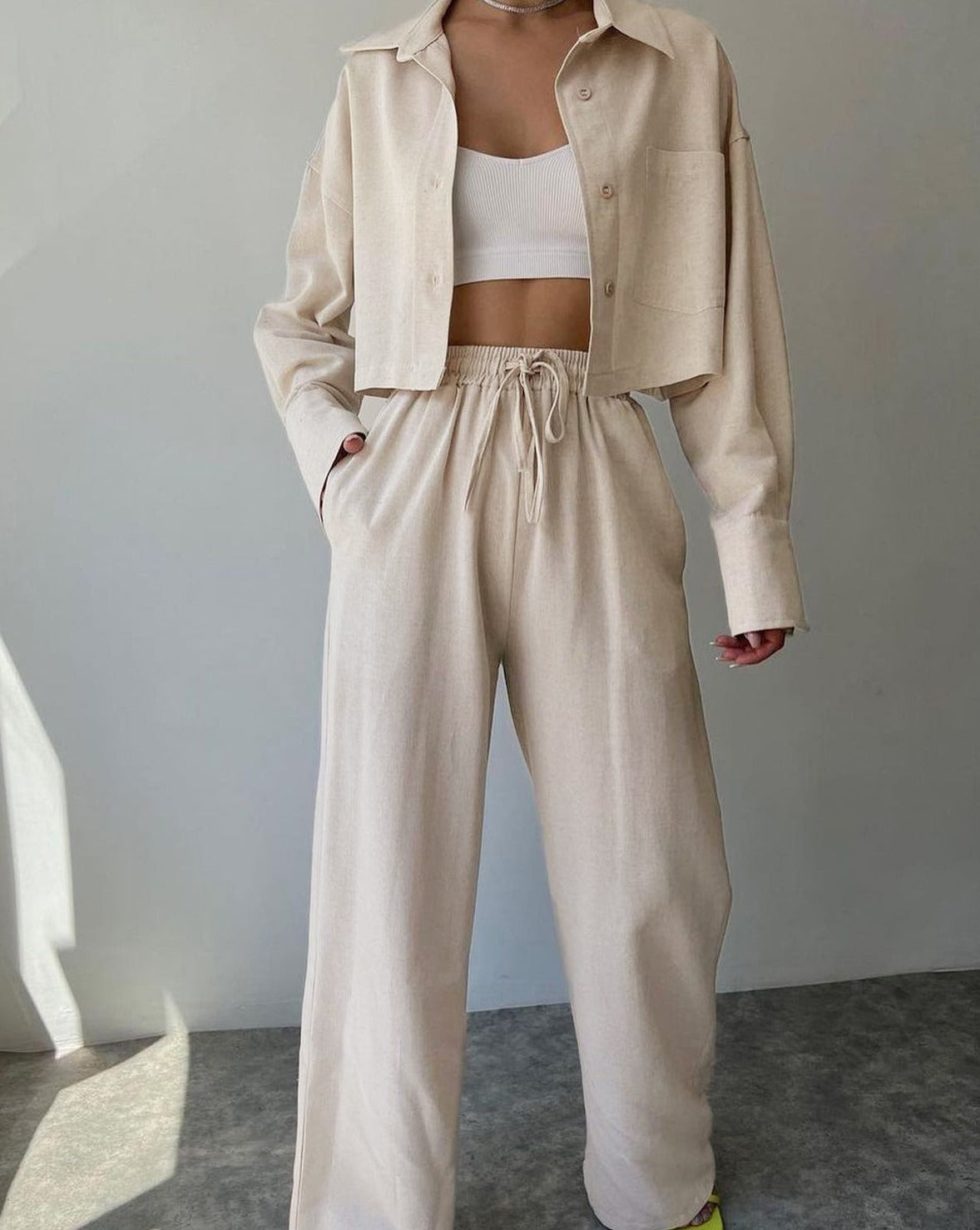 Collared Drawstring Two Piece Pants Set