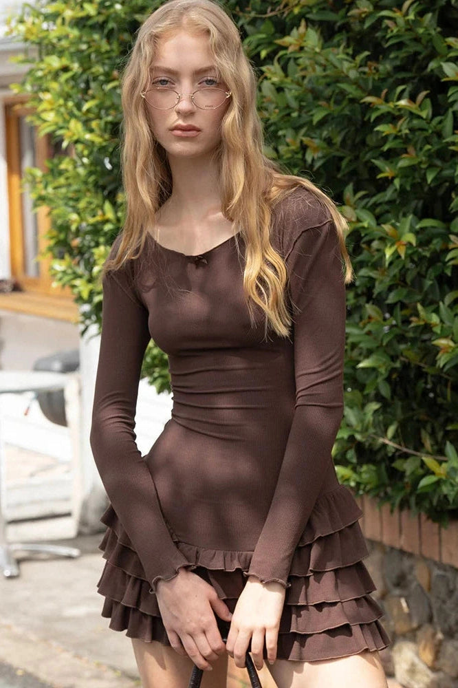 Elegant mini dress featuring long sleeves and a flattering high waist. designed for a stylish look.